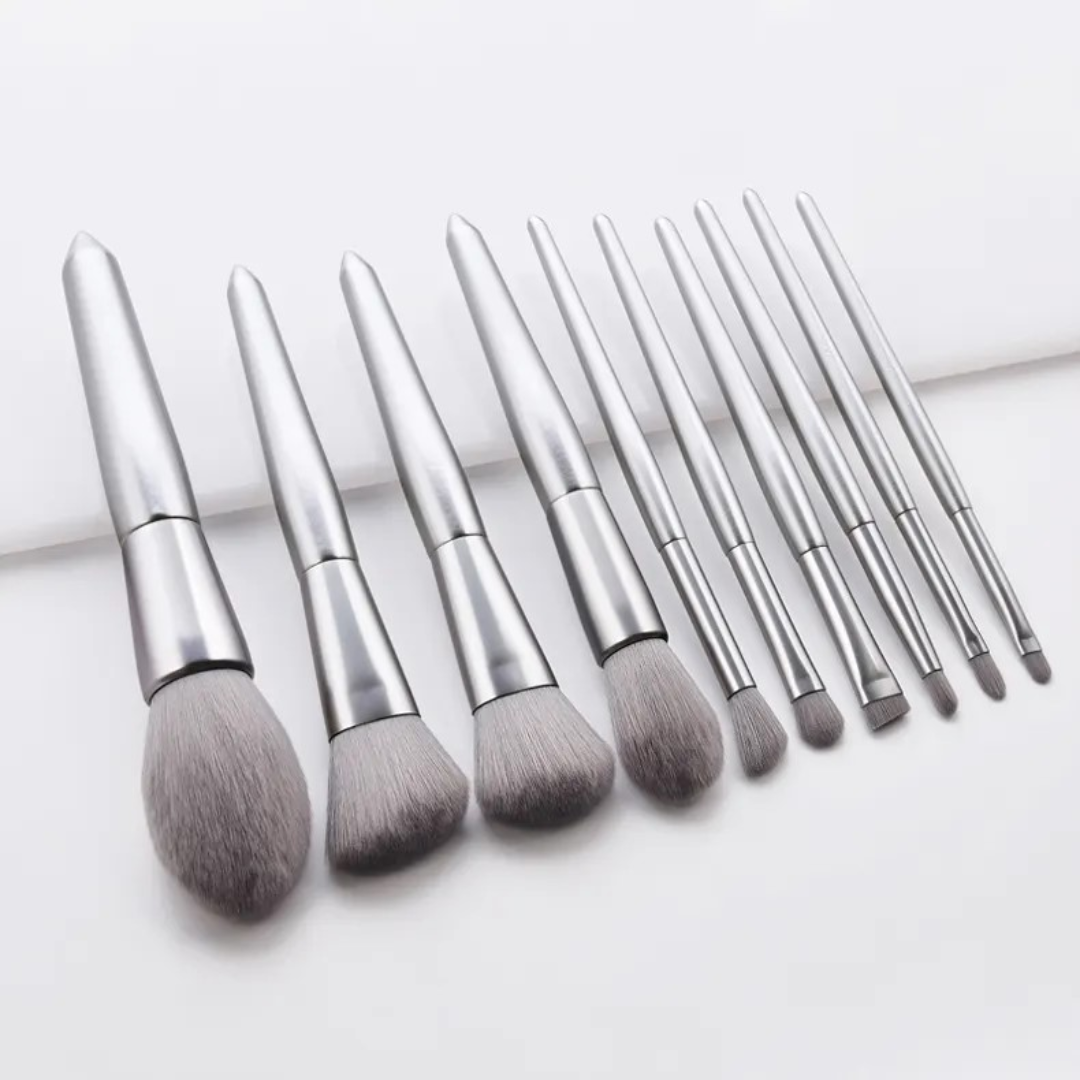 Set de 10 pensule de machiaj, cu mâner din lemn cu inserție metalică și păr sintetic moale, pentru aplicări precise și uniforme.