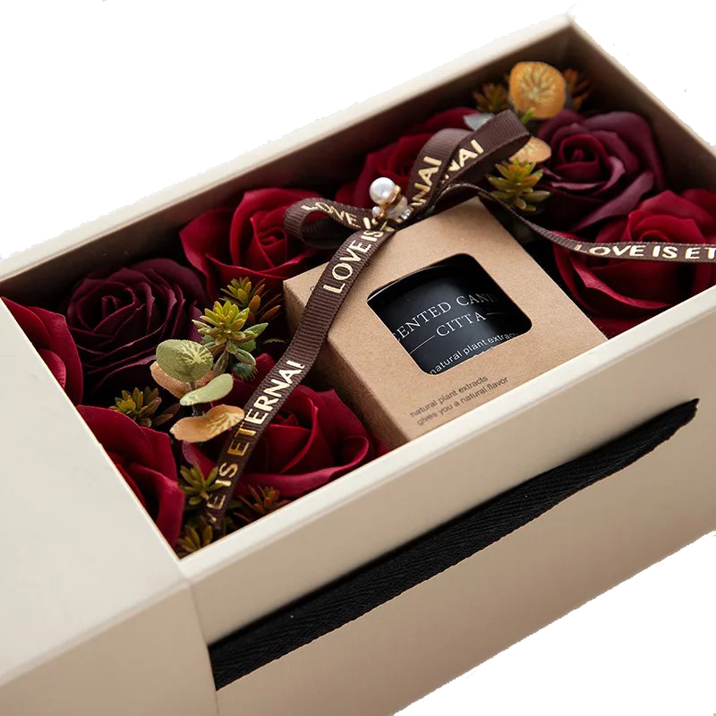 Set cadou elegant cu lumânare parfumată și trandafiri din săpun roșii, ideal pentru ocazii speciale și romantice.
