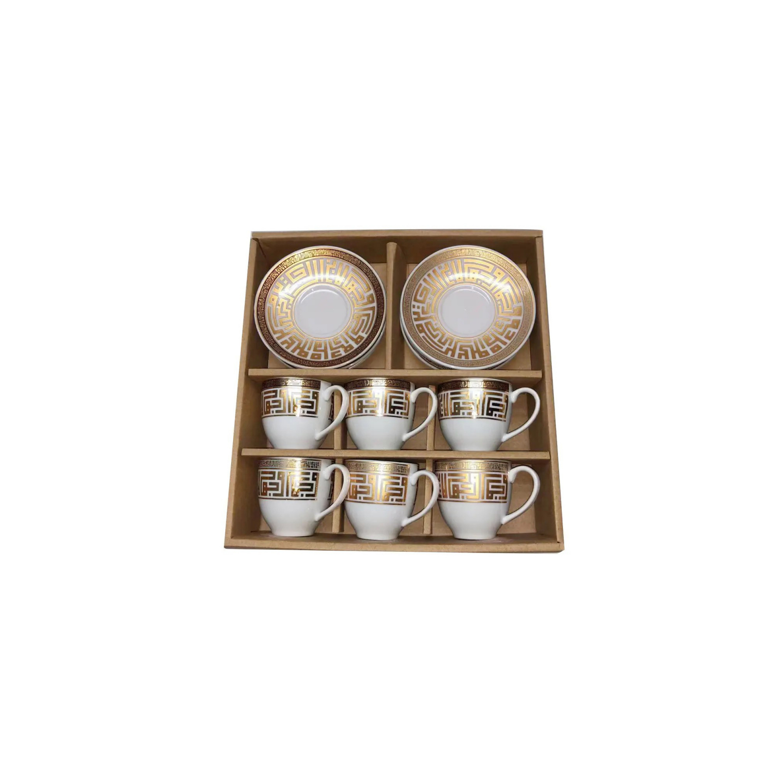 Set elegant de 12 piese din ceramică, alb cu inserții aurii și model grecesc, perfect pentru servirea cafelei sau ceaiului.