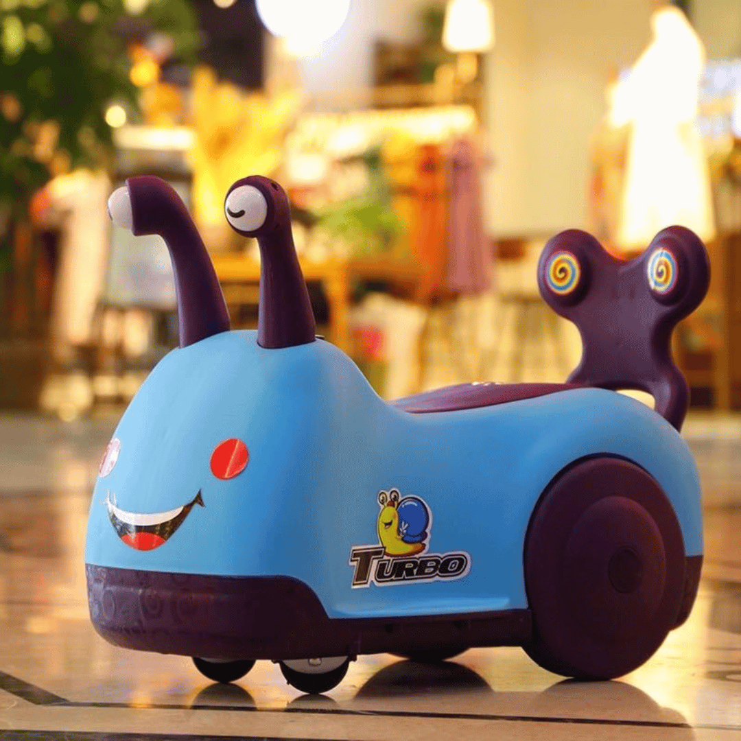 Premergător interactiv în formă de melc, cu lumini, sunete și spațiu de depozitare, ideal pentru dezvoltarea mobilității copiilor.