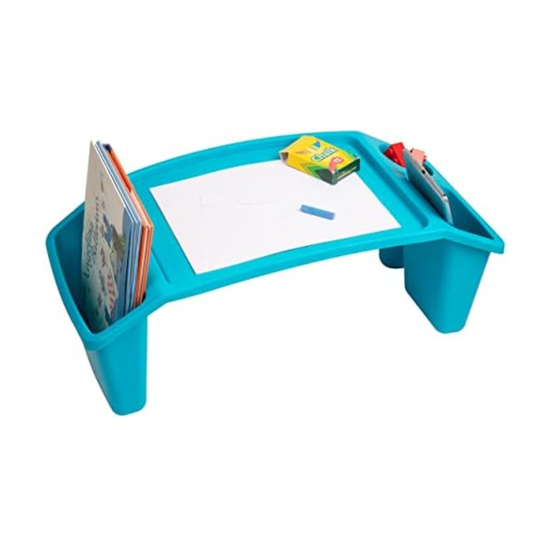 Proiectată pentru a fi poziționată deasupra picioarelor copilului, măsuța dispune de trei spații laterale de depozitare: două cutii laterale (24x9x17 cm și 15,5x9x27 cm), perfecte pentru creioane, jucării sau alte accesorii, și un suport circular cu diametrul de 8 cm pentru pahar sau sticlă. Aceasta poate fi utilizată pe pat, canapea sau podea, adaptându-se cu ușurință nevoilor copilului.