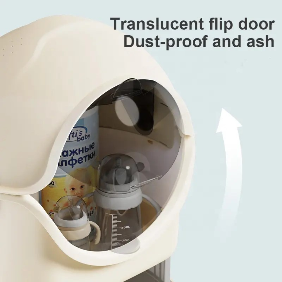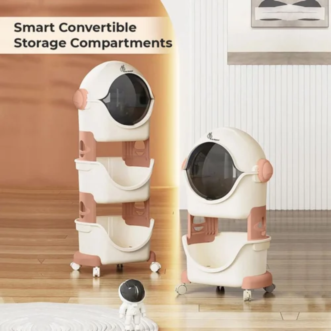 Fabricat din plastic durabil, raftul este ușor de curățat și oferă două nivele spațioase pentru depozitarea jucăriilor, cărților sau altor obiecte esențiale. Partea superioară, modelată sub forma unei căști de cosmonaut, adaugă un plus de magie și imaginație decorului camerei copilului. Mobilitatea este asigurată de cele patru roți, permițând mutarea facilă a raftului în orice colț al camerei.