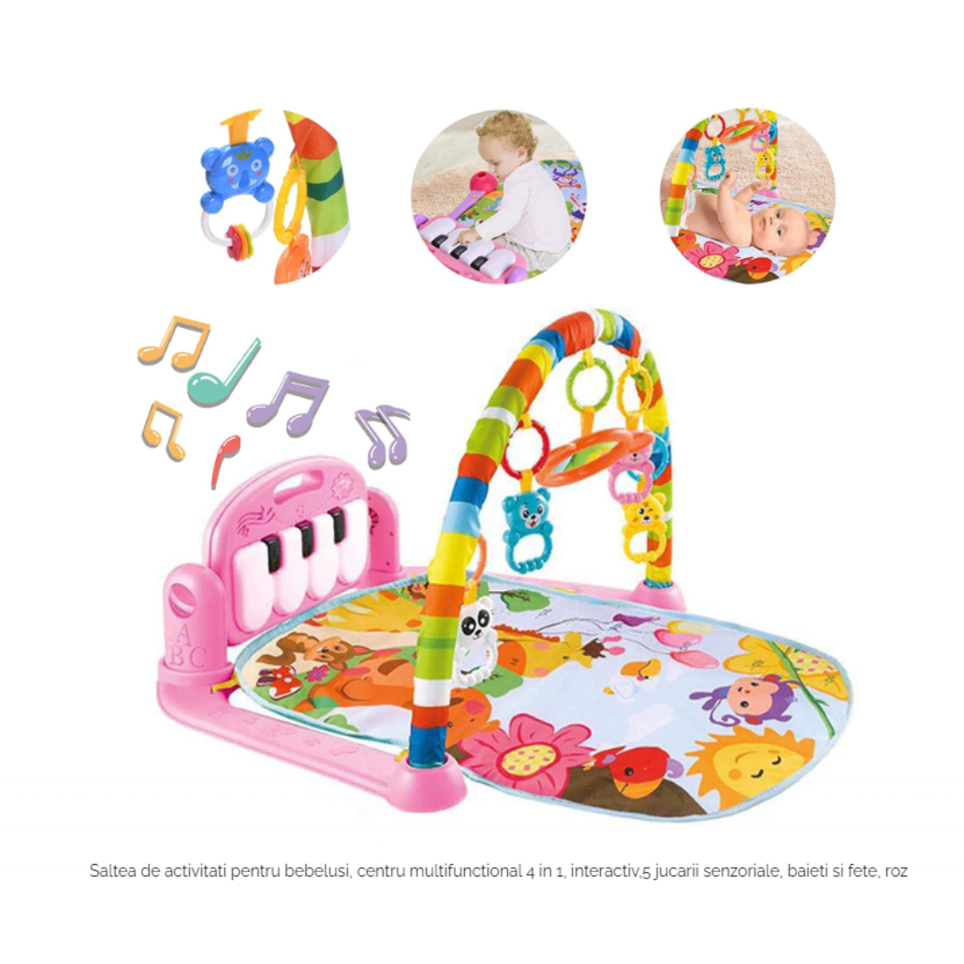 O saltea de activități ovală, 4 în 1, interactivă, cu lumini, sunete, pian detașabil și arcadă detașabilă, ideală pentru dezvoltarea bebelușilor.