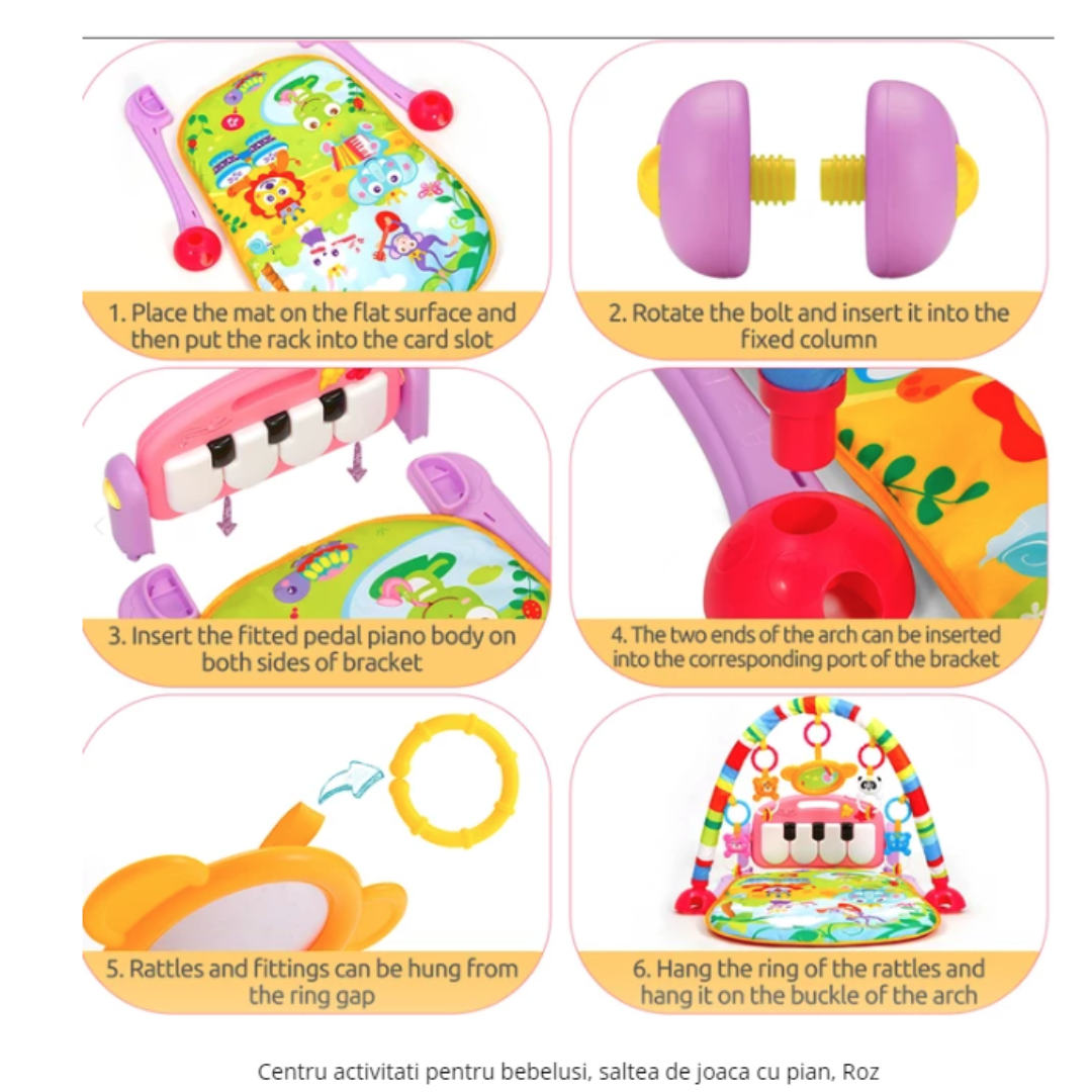 Acest centru de activități 4 în 1 pentru copii reprezintă o oază a distracției și dezvoltării în prima etapă a vieții. Cu un design plin de culoare și motive grafice cu animale vesele, acest centru oferă nu doar divertisment, ci și siguranță. Mânerele cusute dintr-o bandă durabilă pe stâlpi permit agățarea inelelor și zornăitoarelor, contribuind la dezvoltarea abilităților motorii fine ale copilului. Toate elementele sunt atent dimensionate și durabile, asigurând siguranța și sănătatea micuțului explorator.