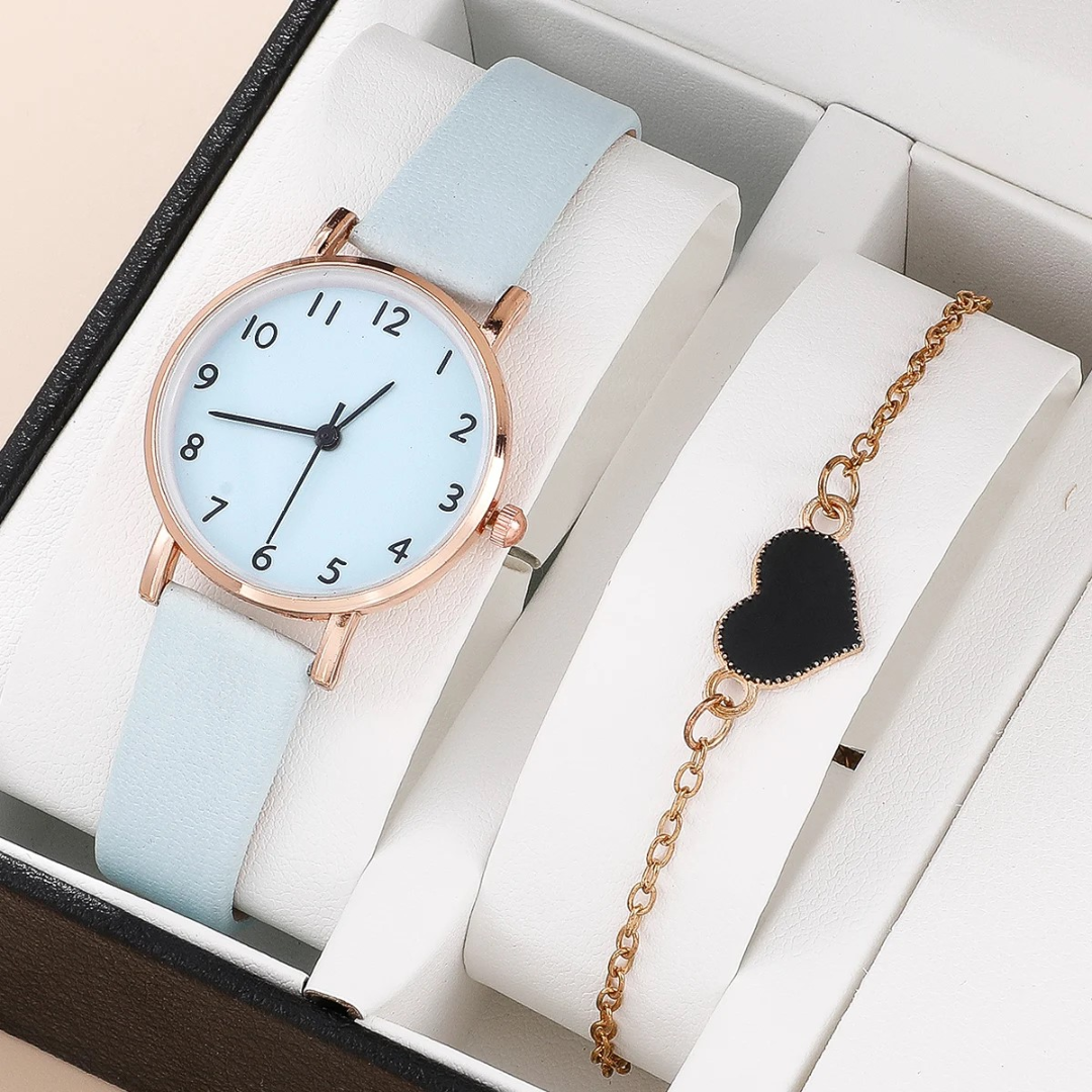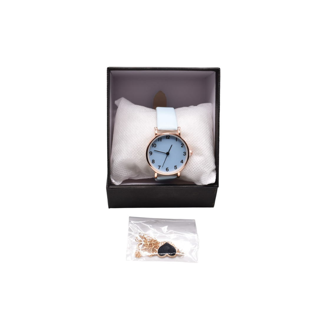 Acest pachet cadou conține un ceas feminin elegant și o brățară delicată cu inimă, fiind o alegere ideală pentru un cadou special sau pentru a te bucura de un accesoriu rafinat. Ceasul are un cadran rotund, de culoare albă, cu indicatoarele orelor reprezentate prin cifre romane negre, oferind o lizibilitate clară și un aspect clasic. Carcasa subțire, de culoare aurie, completează designul elegant al ceasului.