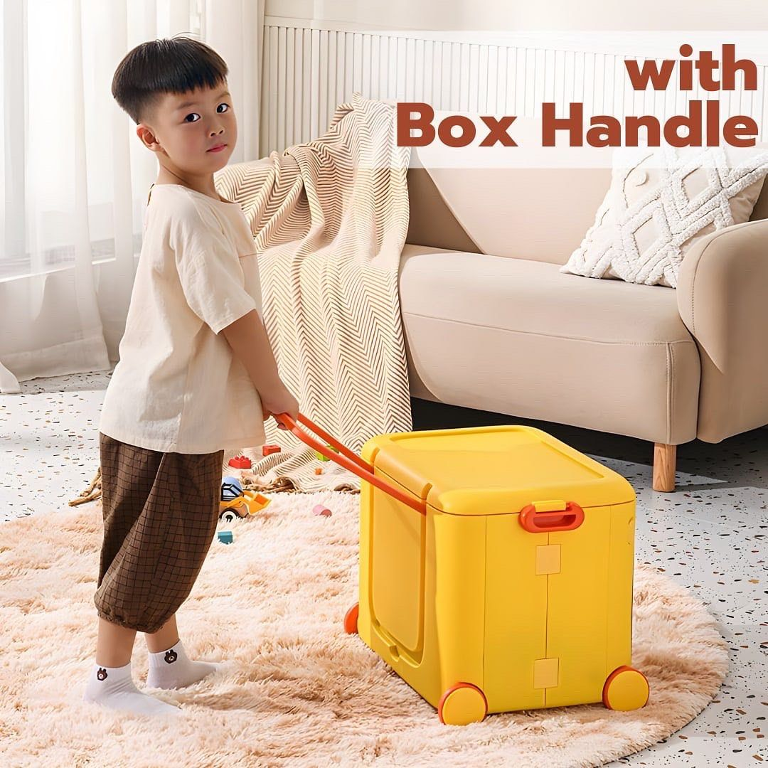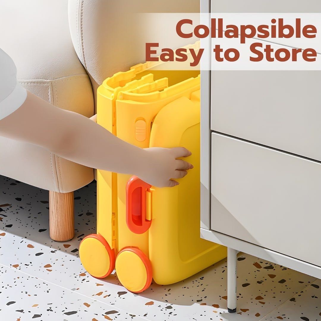 Cutie pliabilă din plastic, galbenă, cu roți și mânere, ideală pentru depozitarea jucăriilor și altor articole. Fabricată din plastic ABS, este durabilă, ușor de utilizat și economisește spațiu.
