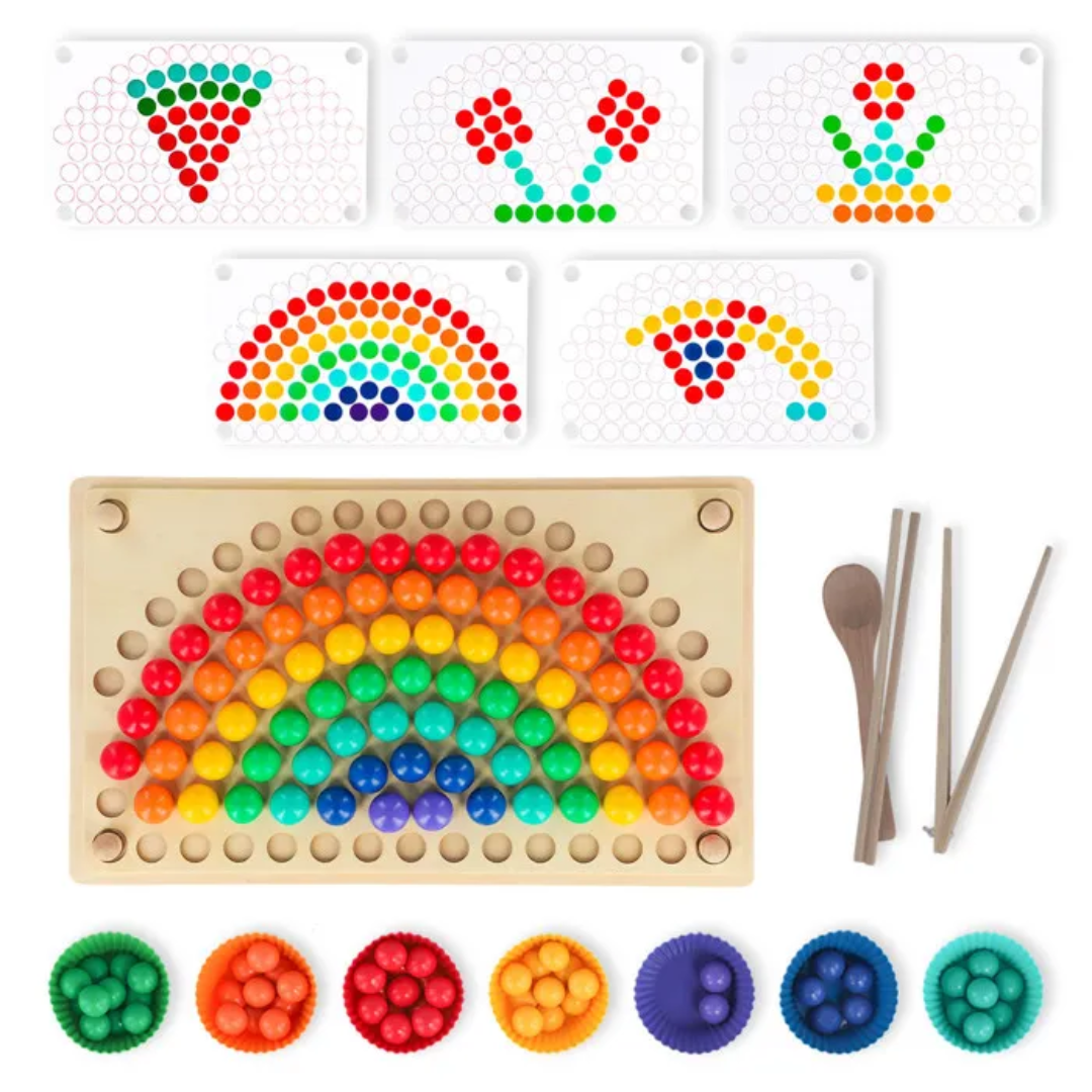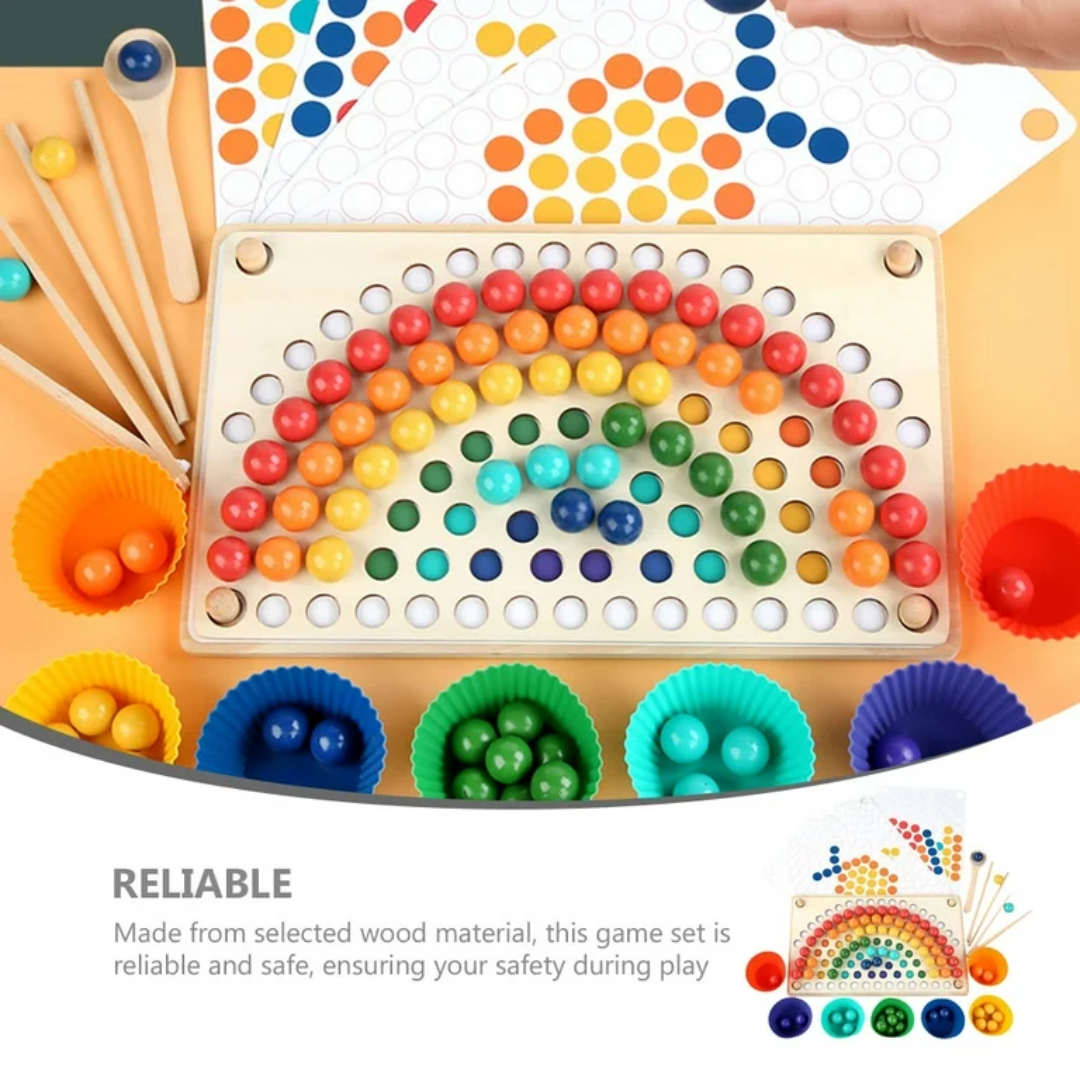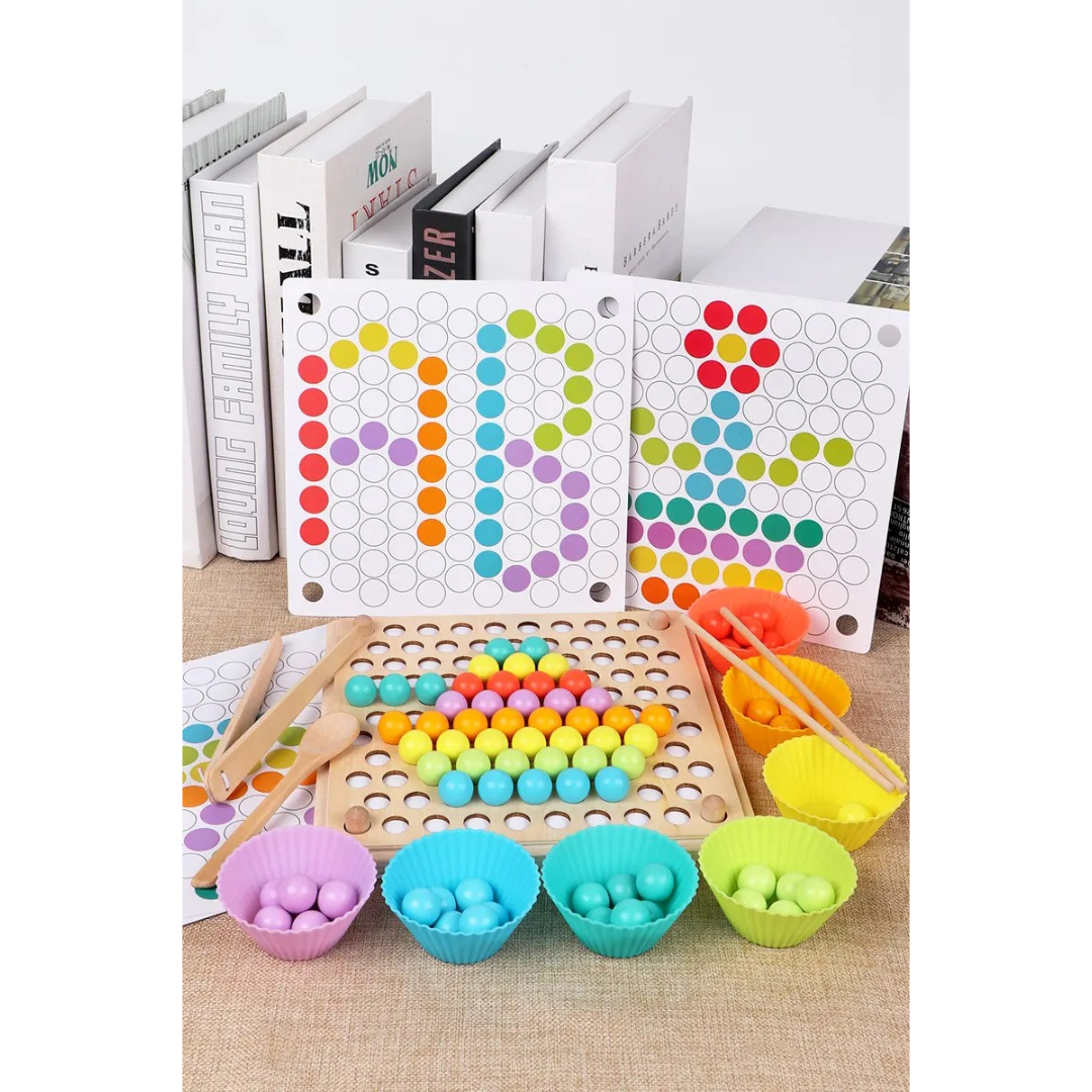 Acest joc Montessori este conceput pentru a stimula dezvoltarea creativității și abilităților motorii fine ale copiilor. Cu 77 de bile colorate și 7 pahare din silicon în nuanțe vibrante de curcubeu, jocul oferă o experiență interactivă de învățare. Fiecare biluță și formă devine o provocare captivantă, ajutându-i pe copii să exploreze culorile, formele și texturile. Pe măsură ce copii manipulează bilele și paharele, aceștia își îmbunătățesc dexteritatea și își dezvoltă gândirea logică.
