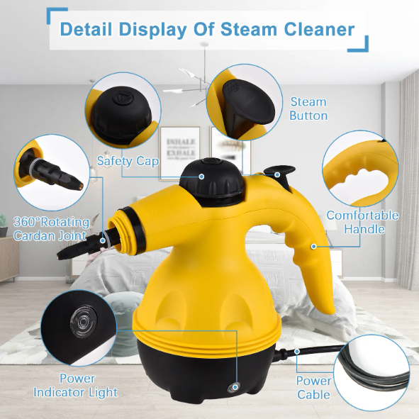 Aparat de curățat manual cu abur, 1000W, 9 accesorii incluse, ideal pentru baie, bucătărie, geamuri și gresie