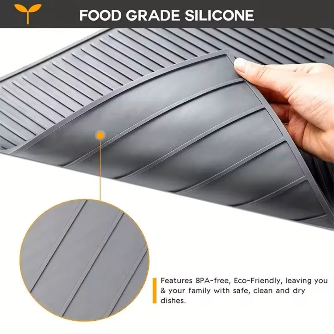 Covoraș din silicon pentru scurgerea vaselor, ușor de curățat, rezistent la căldură și protejează suprafețele sensibile.