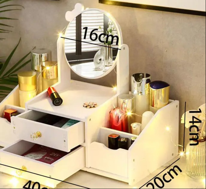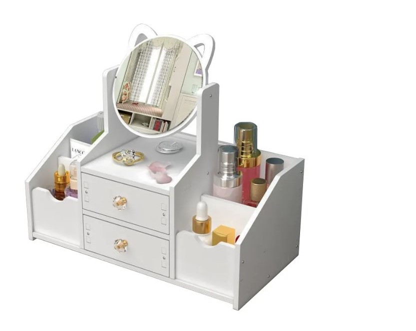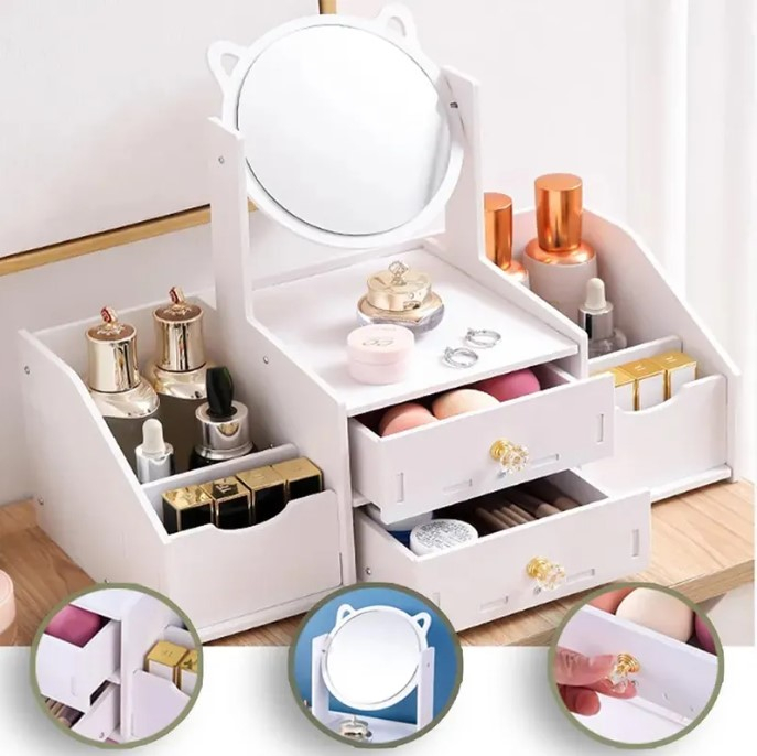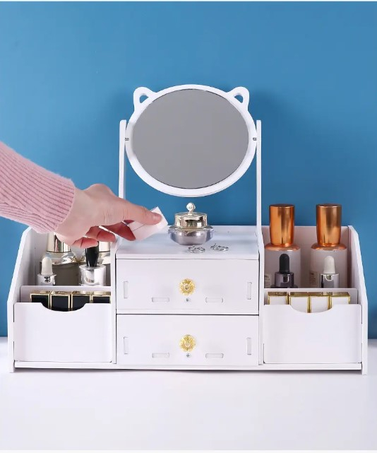 Descopera organizatorul ideal pentru pastrarea in ordine a cosmeticelor si bijuteriilor tale. Cu un design modern si elegant, acest organizator este prevazut cu 2 sertare spatioase si 4 compartimente deschise, perfecte pentru farduri, pensule, rujuri sau accesorii pretioase.