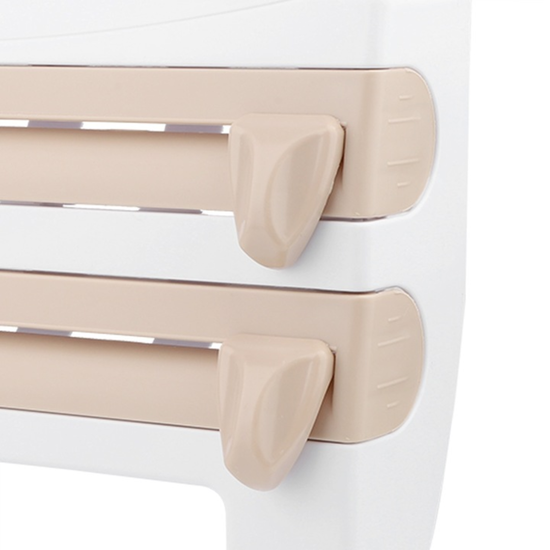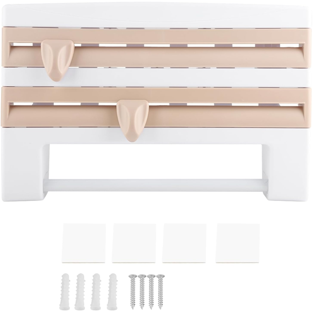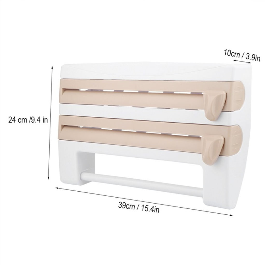 Dispenser elegant și practic pentru folie alimentară, folie de aluminiu și prosoape de hârtie, alb-bej.