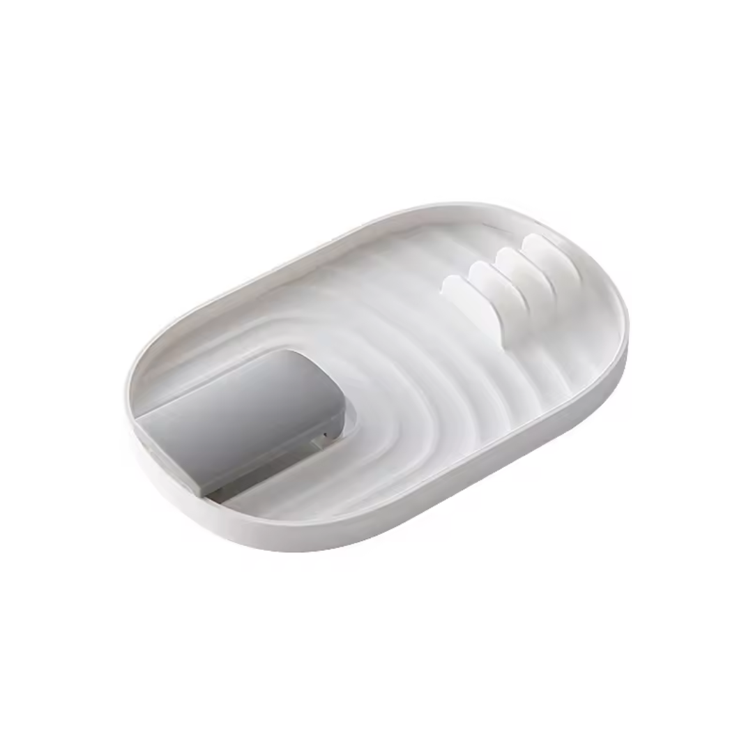 Acest suport ingenios pentru ustensile și capac este un element esențial pentru o bucătărie organizată și curată. Proiectat să acomodeze până la patru linguri sau spatule și un capac, acesta previne murdărirea blatului de lucru cu picături sau resturi alimentare în timpul preparării mâncărurilor.