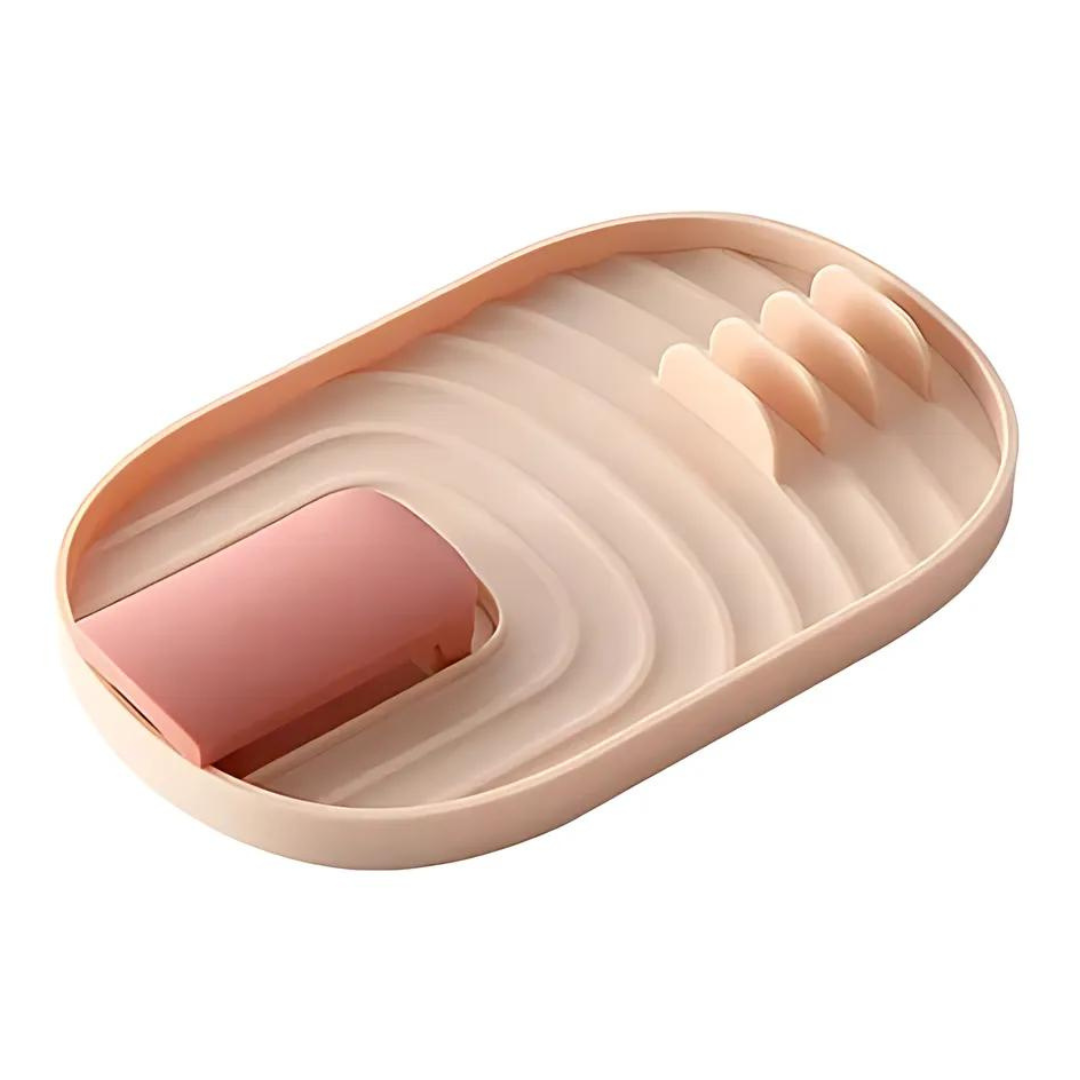 Suport antiscurgere roz pentru ustensile și capac, compact și ușor de curățat, perfect pentru bucătăriile ordonate.