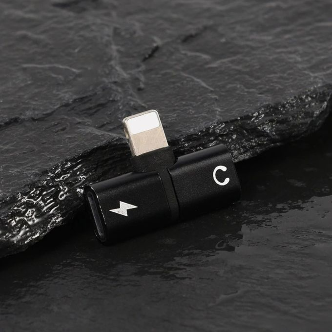 Adaptorul 2 în 1 Lightning din aluminiu permite încărcarea simultană a telefonului Apple și ascultarea muzicii.