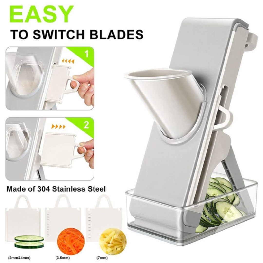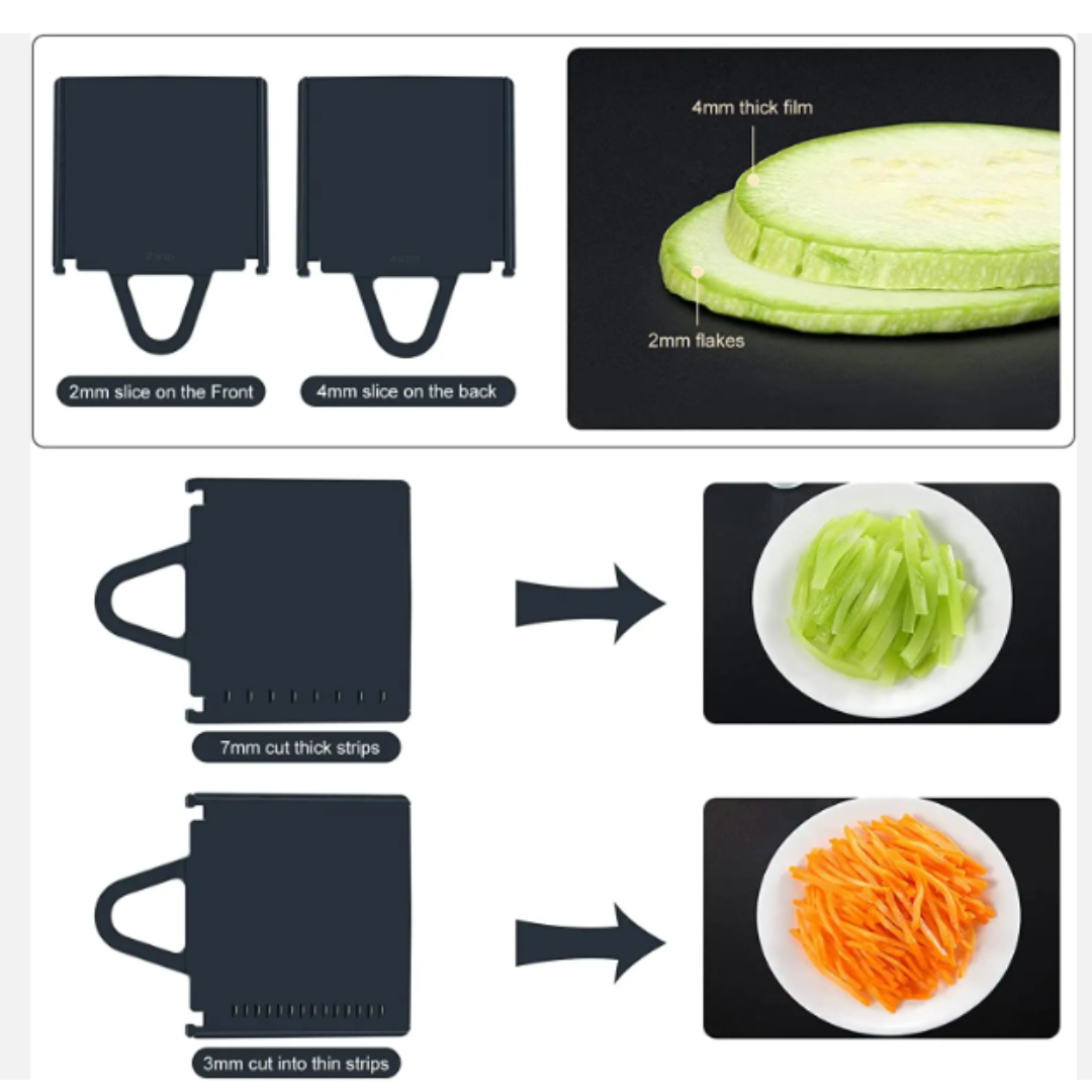 Tampoanele din silicon de pe baza aparatului oferă o stabilitate excelentă, permițându-ți să lucrezi în siguranță și cu precizie. Fie că pregătești salate, garnituri sau feluri principale, acest feliator multifuncțional te ajută să obții rezultate profesionale fără bătăi de cap.
