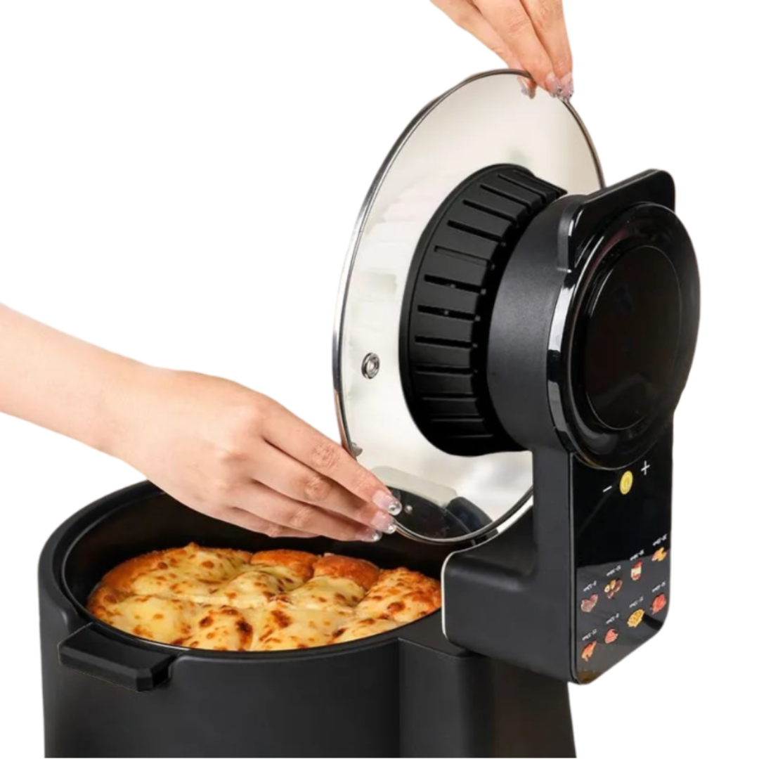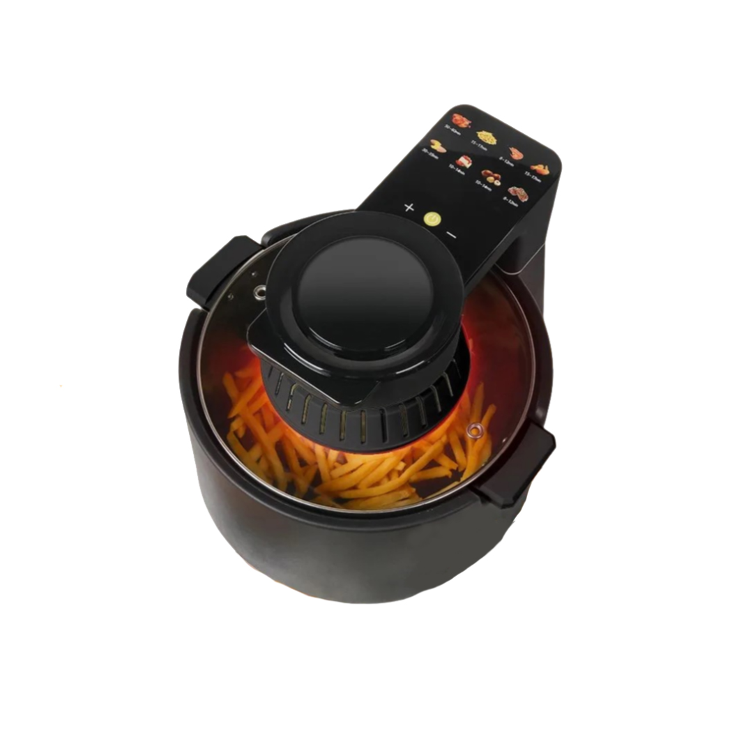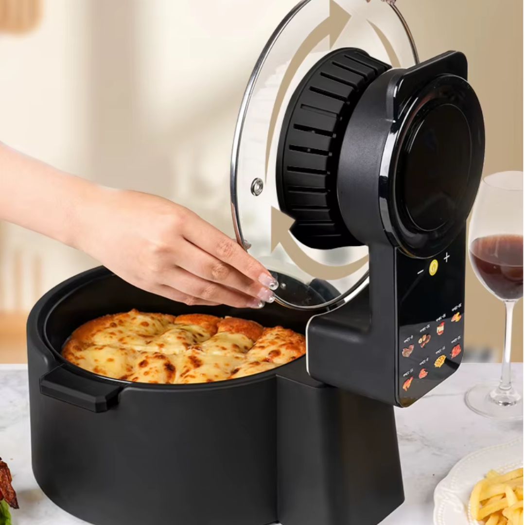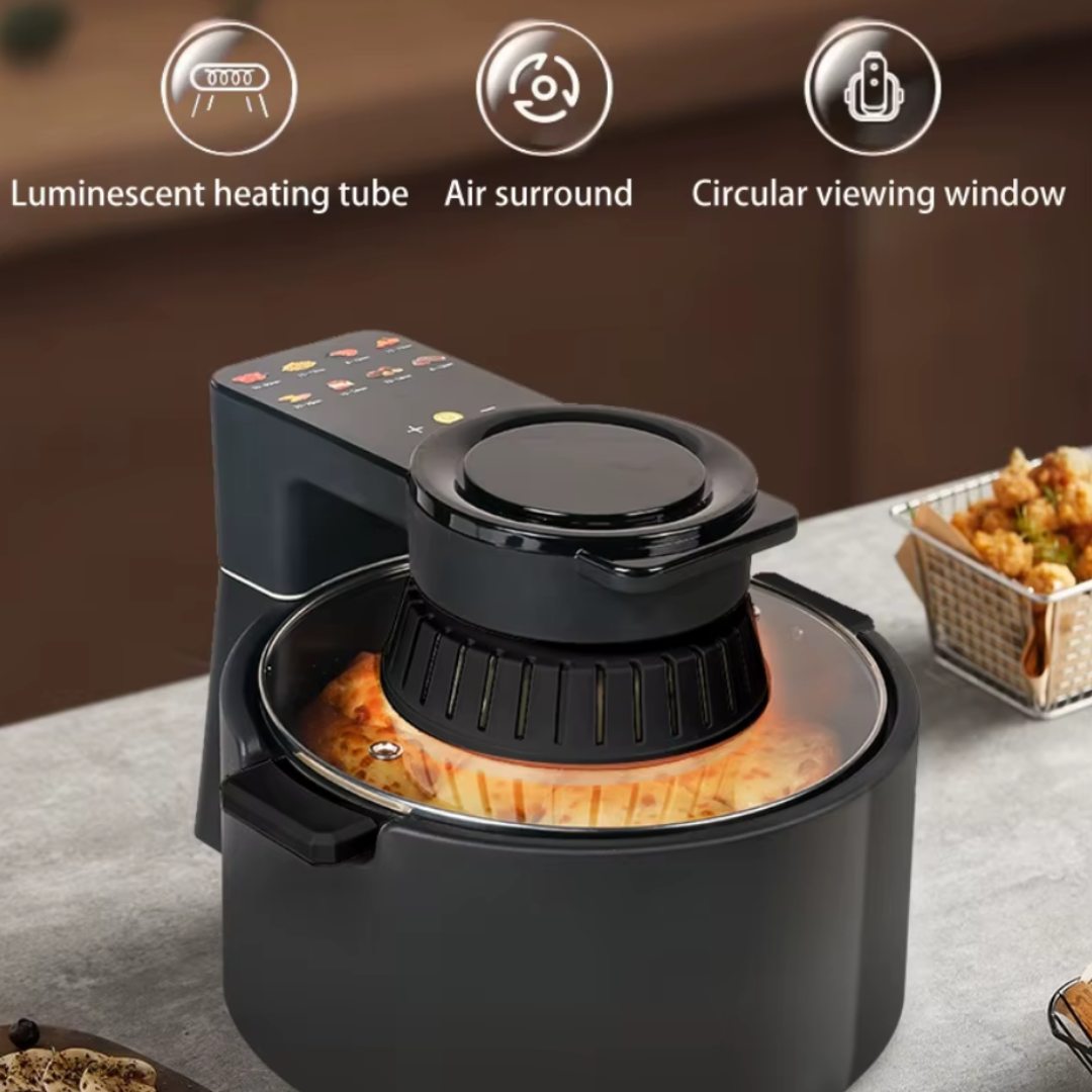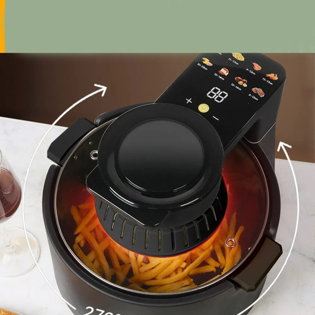 Descoperă plăcerea gătitului sănătos și delicios cu această friteuză fără ulei de 8 L, care redefinește modul în care pregătești mâncarea. Designul circular inteligent asigură o circulație eficientă a aerului, pentru o prăjire uniformă și crocantă, fără necesitatea adăugării de ulei. Fiecare preparat este gătit perfect, iar tu poți urmări procesul prin geamul transparent, care îți oferă vizibilitate constantă asupra preparatelor, fără a fi nevoie să deschizi capacul.