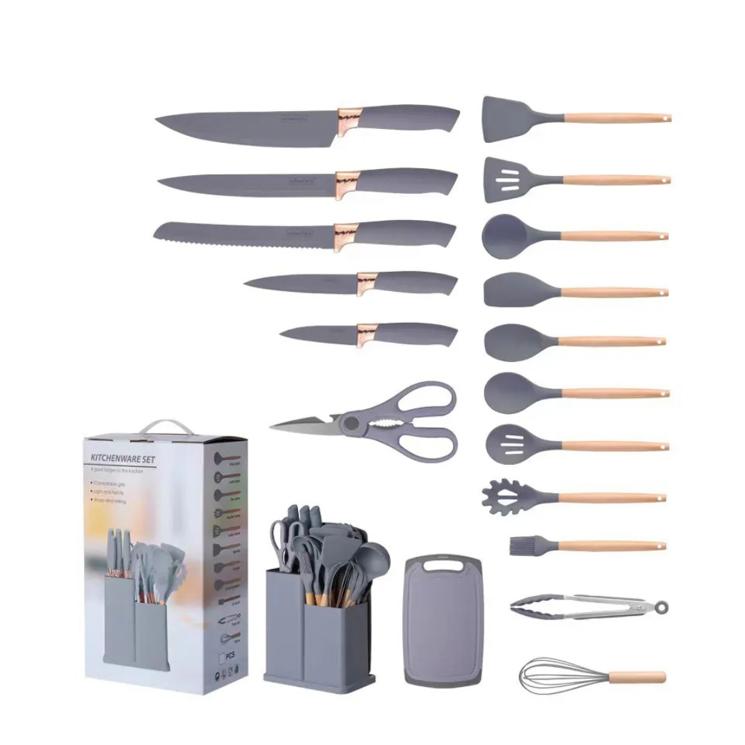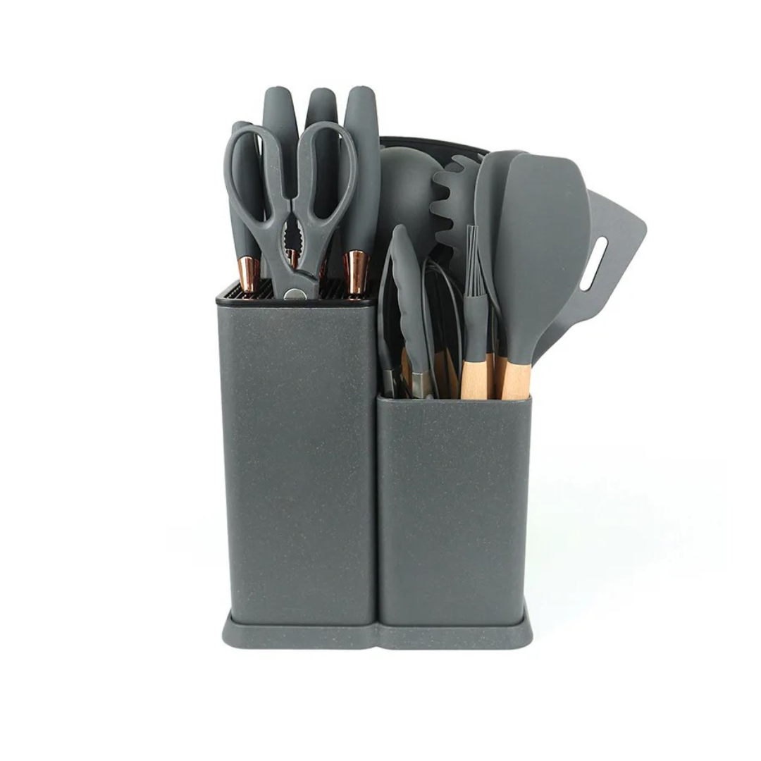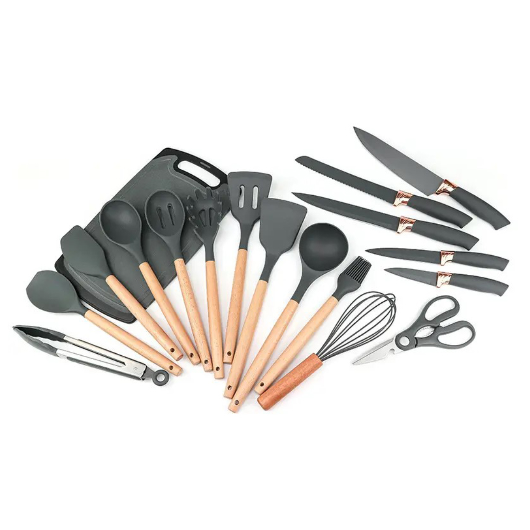 Set complet de 19 piese din silicon și lemn, incluzând ustensile esențiale pentru gătit și un tocător, toate într-o nuanță elegantă de gri.