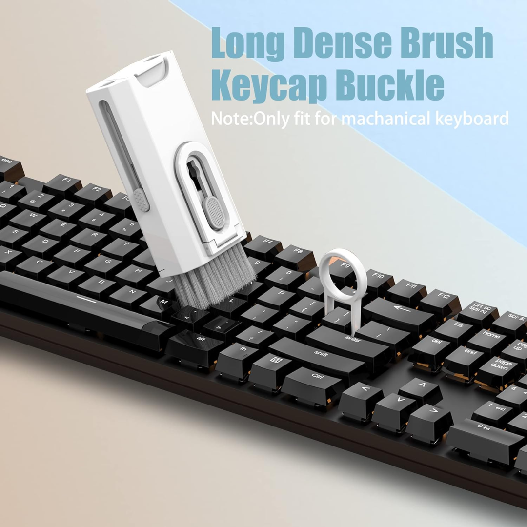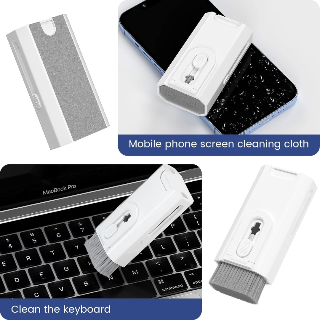 De asemenea, kitul conține un lichid de curățare special formulat pentru a elimina grăsimea, amprentele și murdăria de pe ecrane și suprafețe delicate, fiind non-abraziv și fără a lăsa reziduuri nedorite. Un extractor pentru capacele tastelor tastaturii facilitează îndepărtarea ușoară și precisă a acestora, permițând o curățare completă. O perie specială pentru tastatură, cu peri subțiri și flexibili, ajută la îndepărtarea prafului și murdăriei dintre taste. În plus, kitul include un suport convenabil pentru telefonul mobil, util în timpul curățării sau ca suport practic în diverse situații.