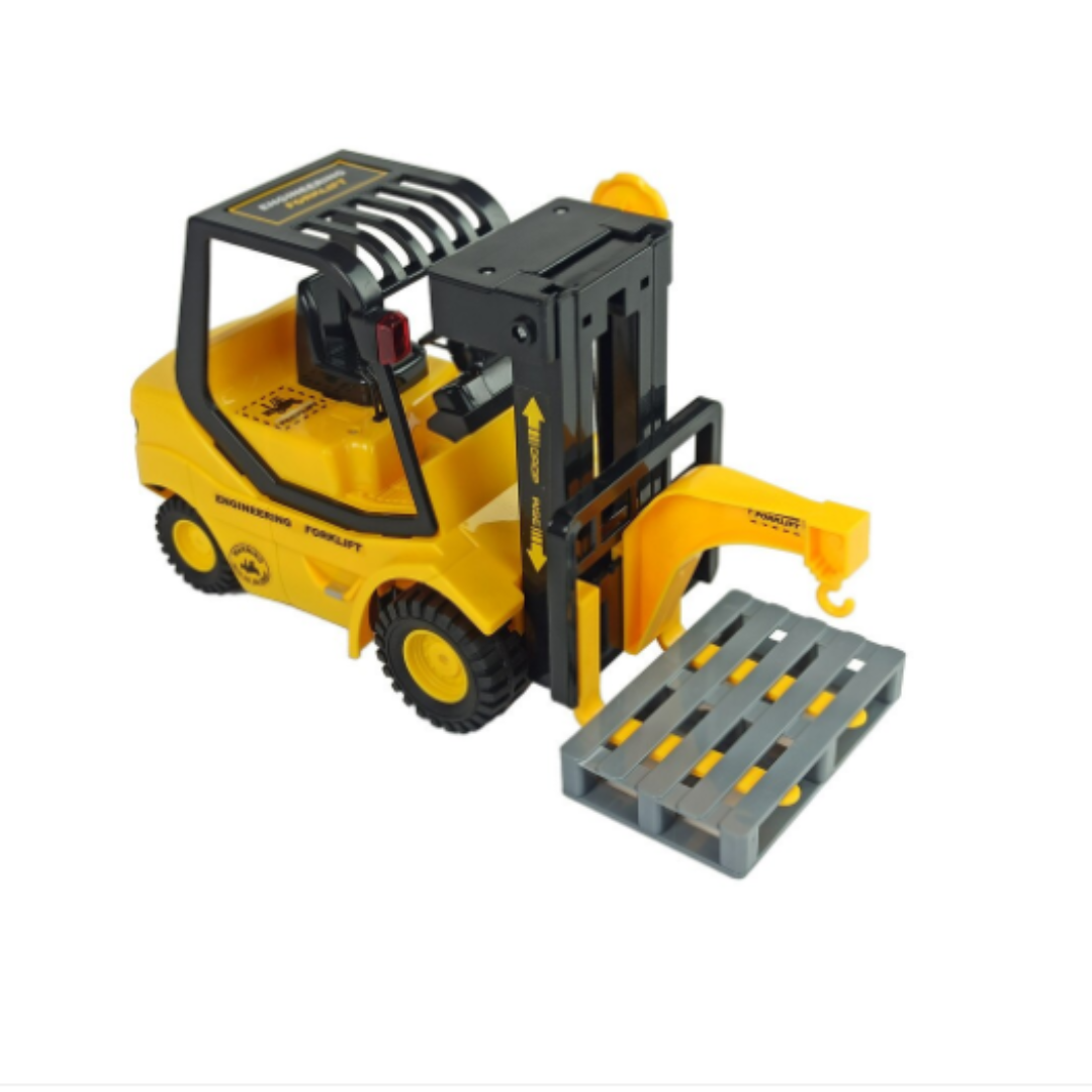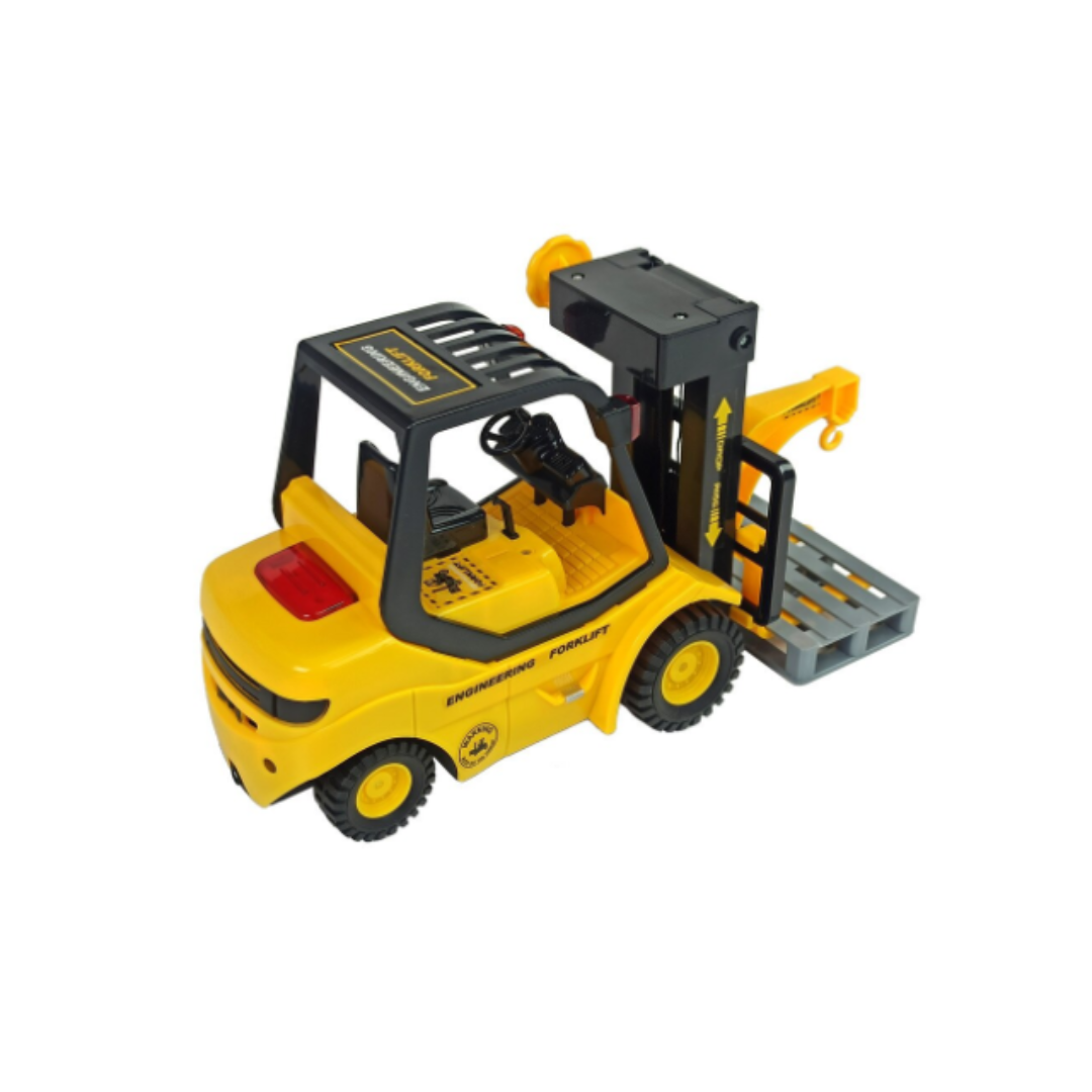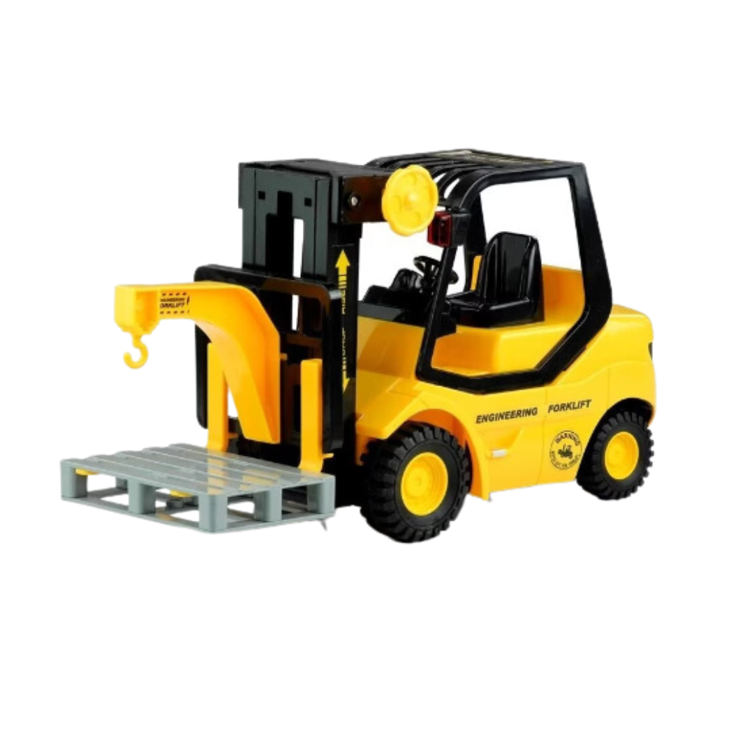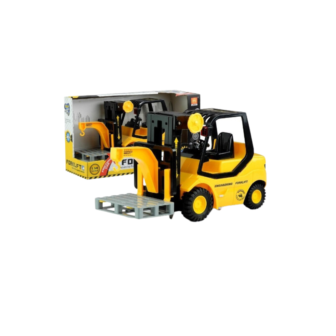 Motostivuitor realist la scară 1:14, cu europalet, fricțiune, efecte sonore și luminoase, ideal pentru pasionații de mașini de construcții.