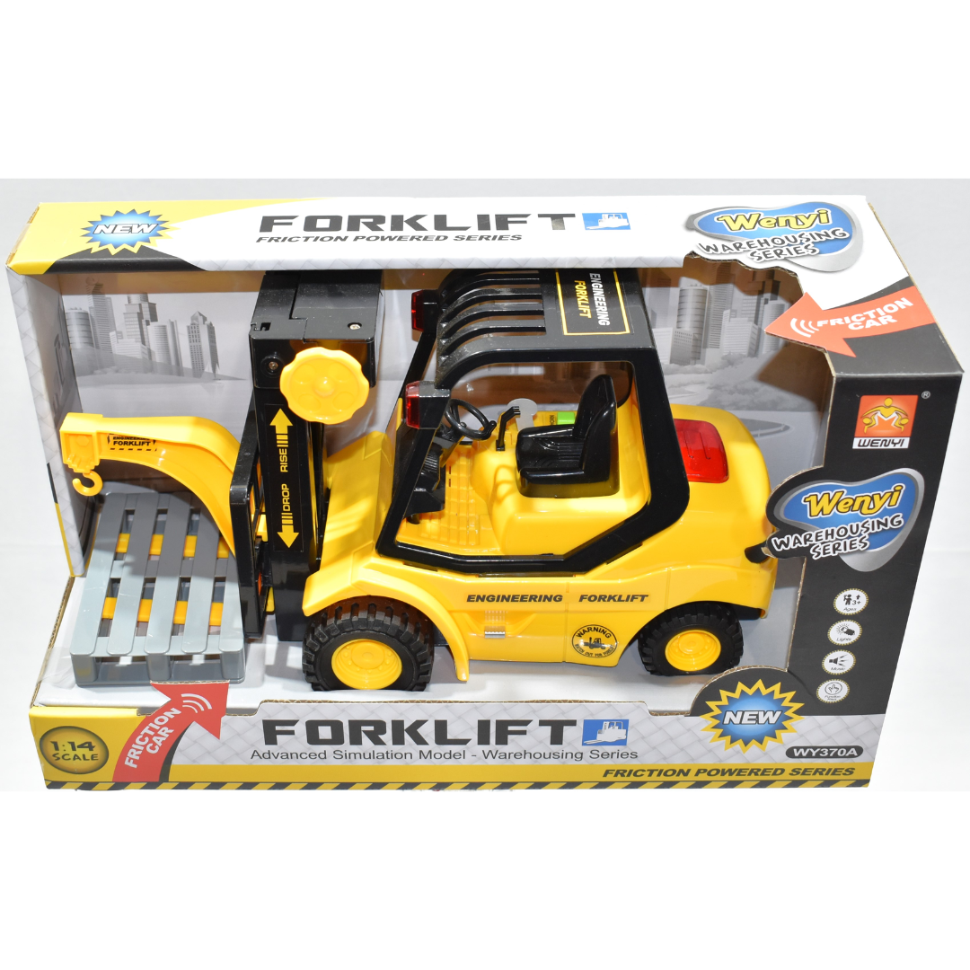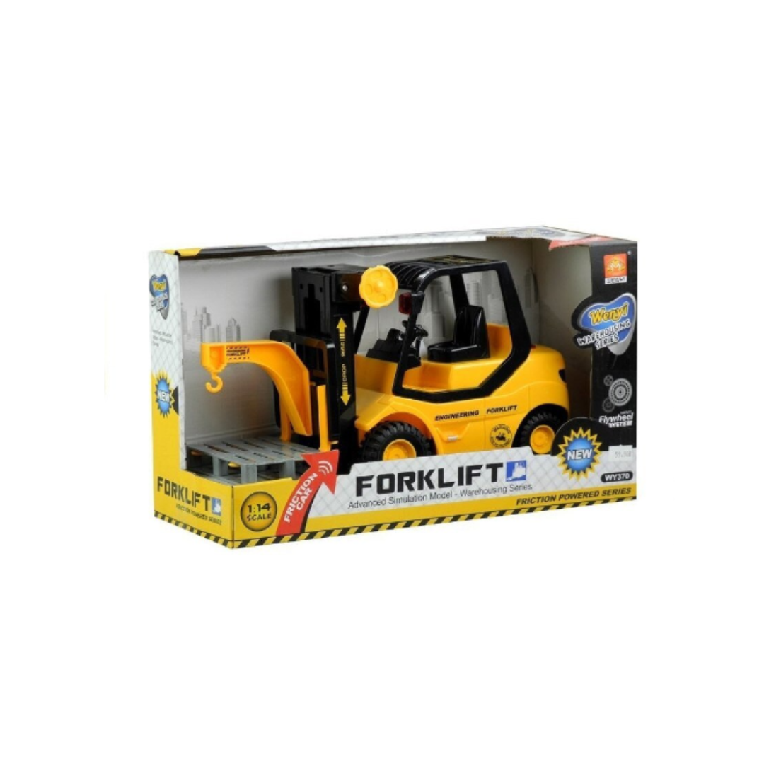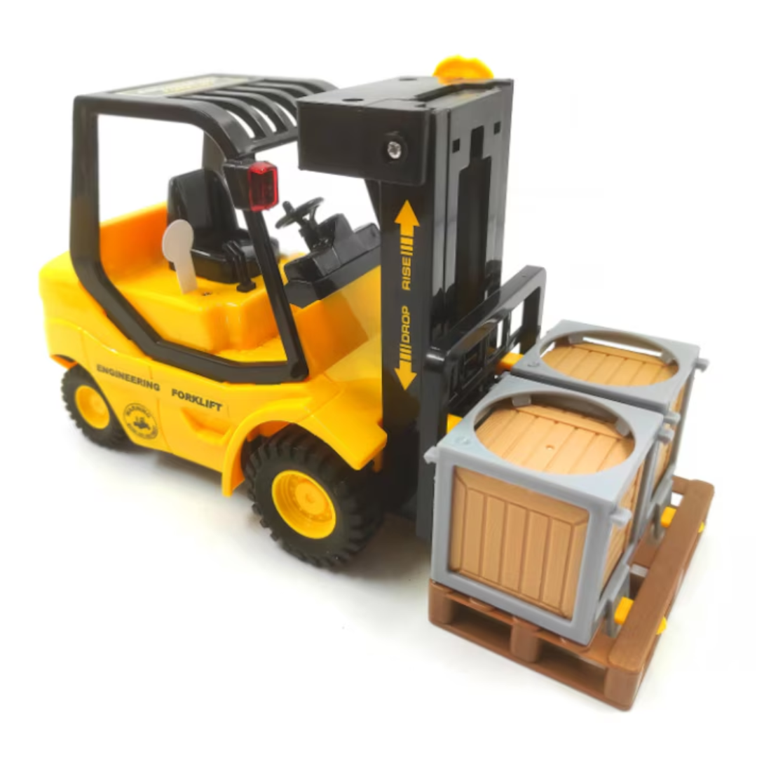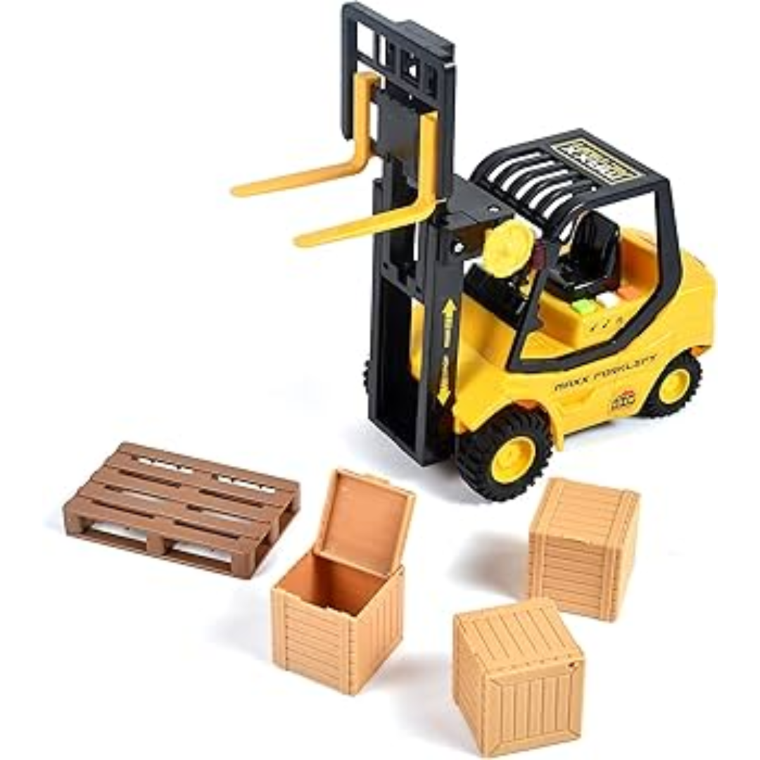 Motostivuitor realist la scară 1:14, cu europalet, fricțiune, efecte sonore și luminoase, ideal pentru pasionații de mașini de construcții.