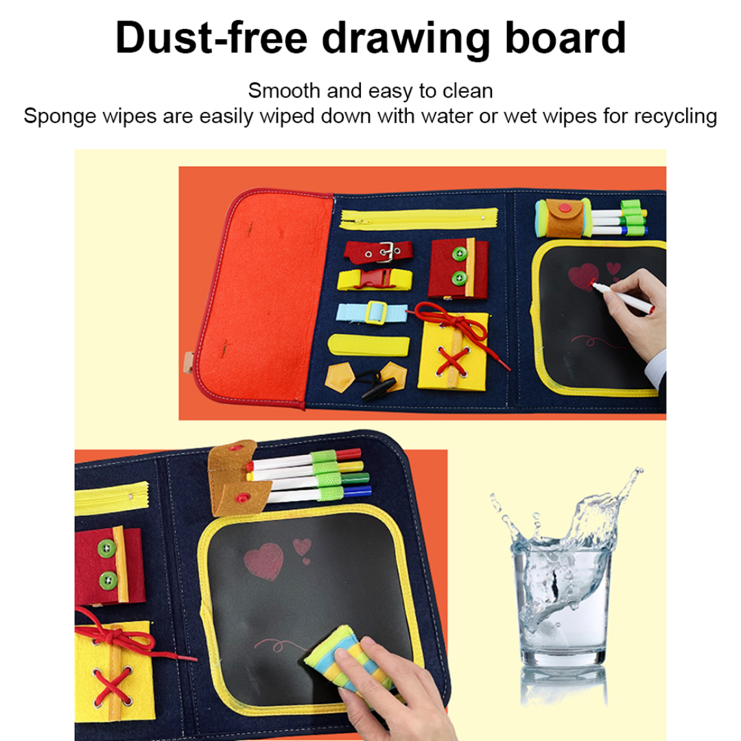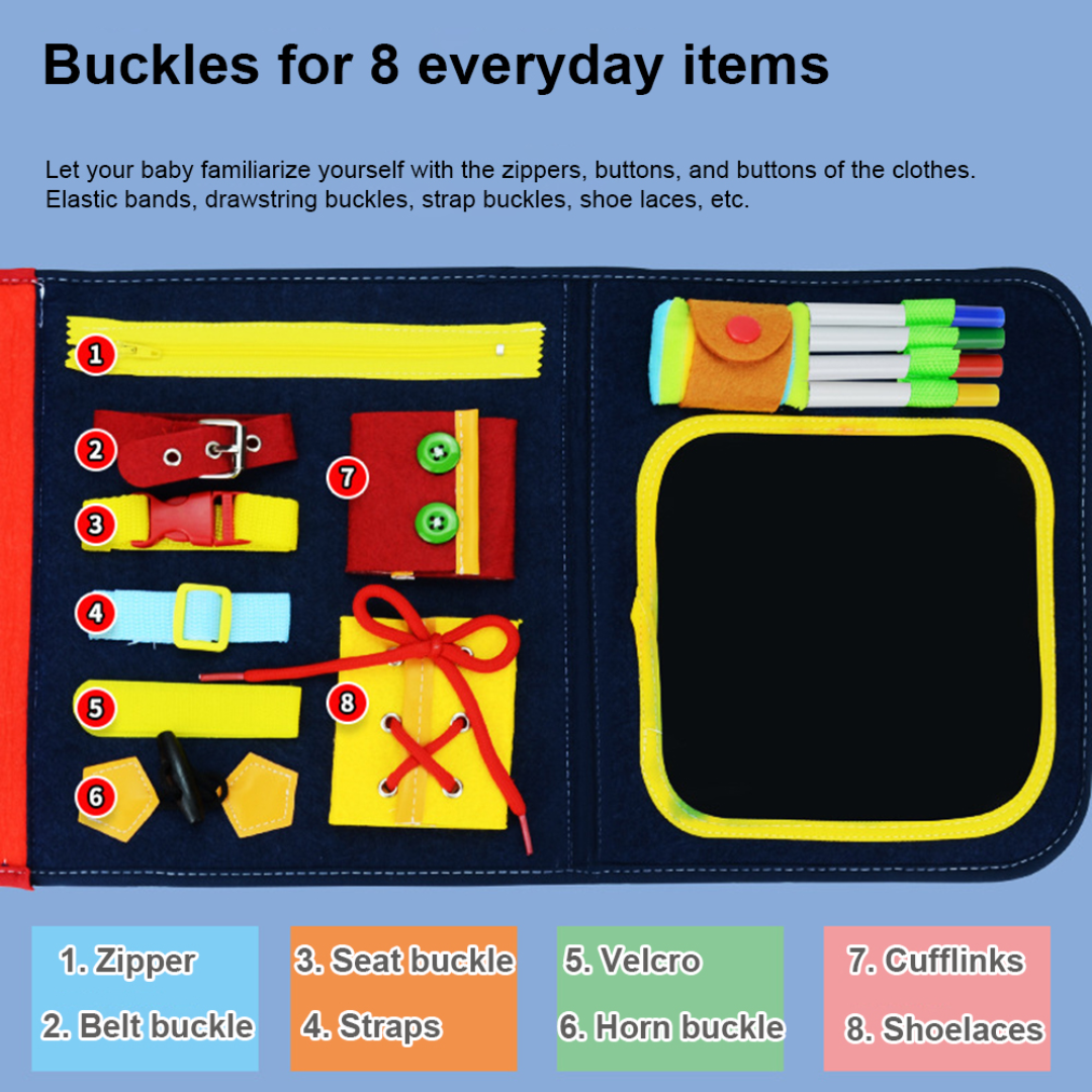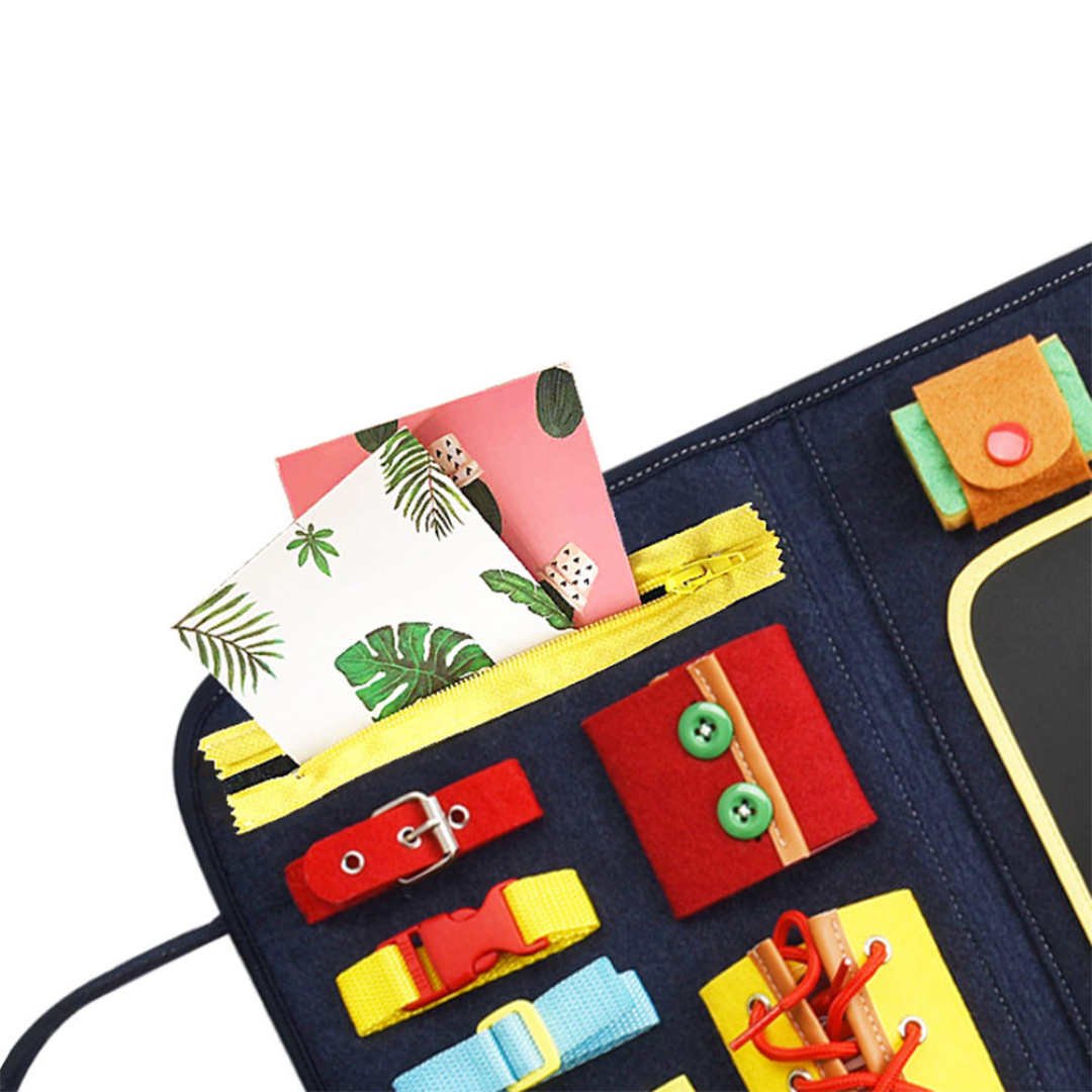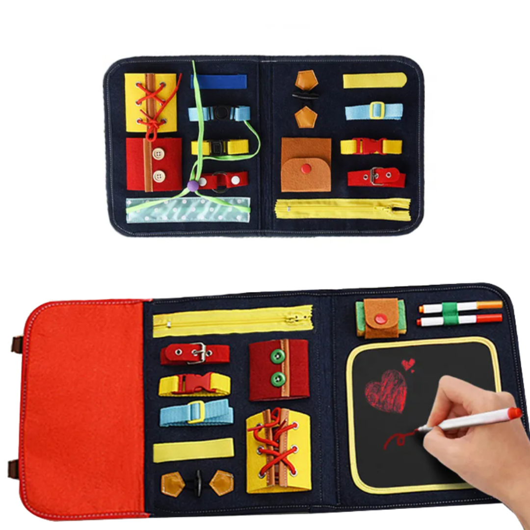 Această carte senzorială, cu 14 elemente și design tip Montessori, este perfectă pentru copiii mici, oferindu-le o experiență de învățare și explorare captivantă. Fiecare element, de la catarame la buzunare cu fermoar, de la șireturi la panglici, este proiectat pentru a stimula simțurile și creativitatea copiilor.