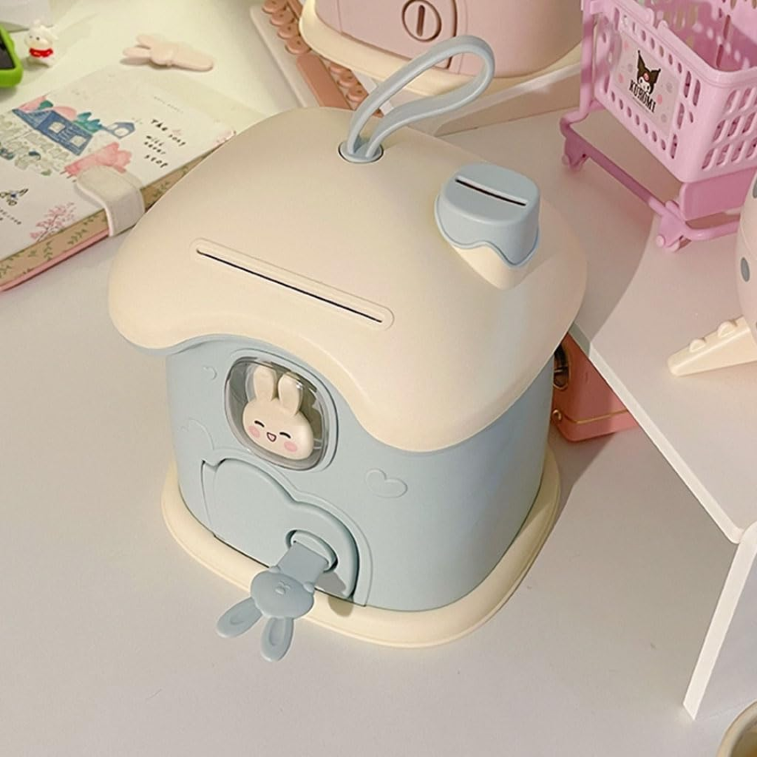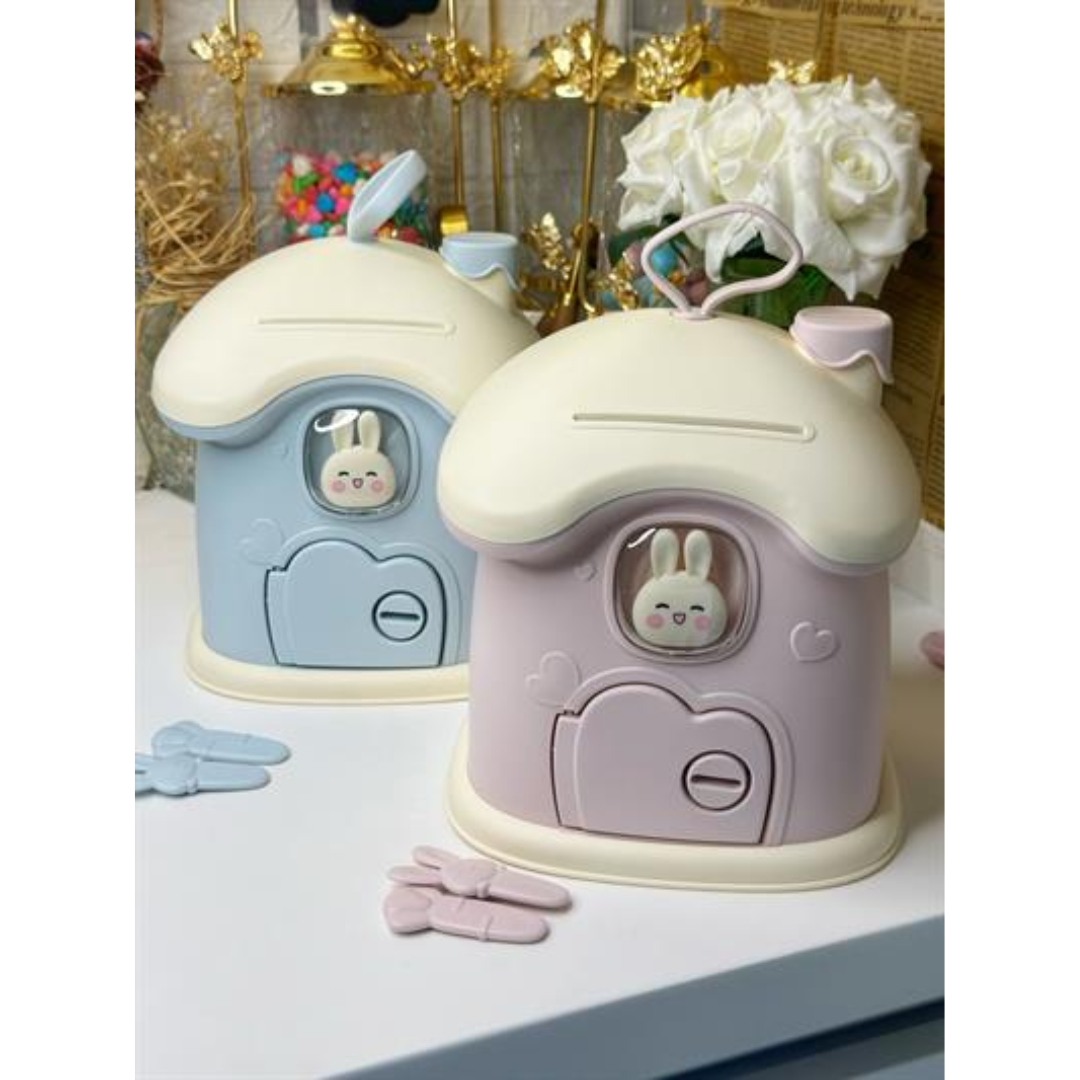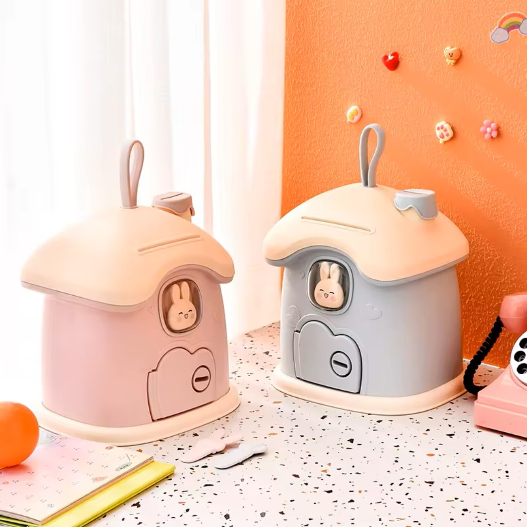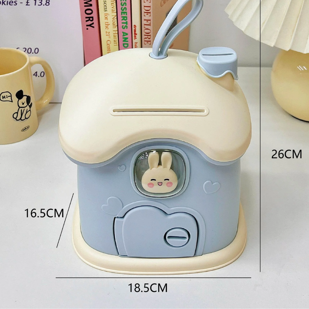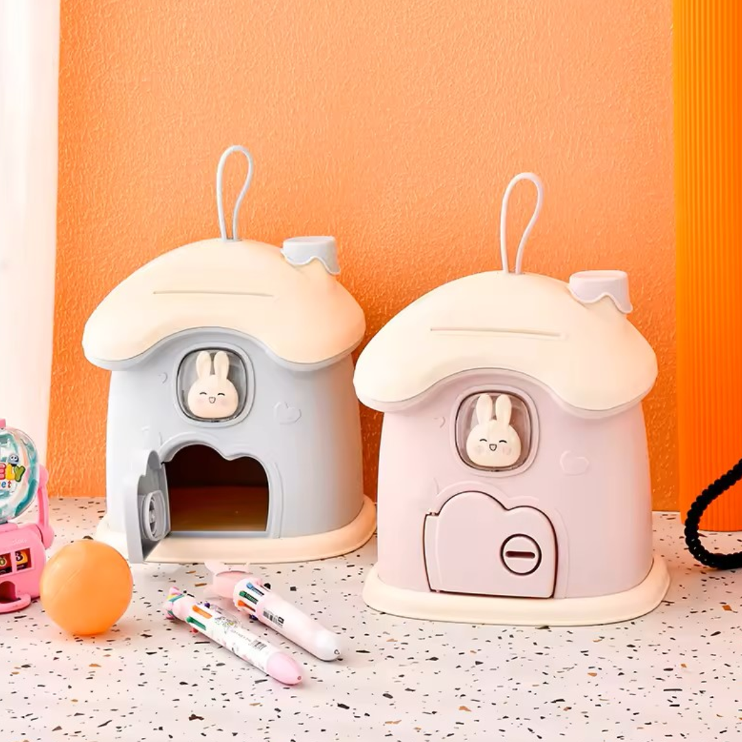 Pusculiță din plastic, în formă de căsuță, perfectă pentru învățarea economisirii, dotată cu cheie.
