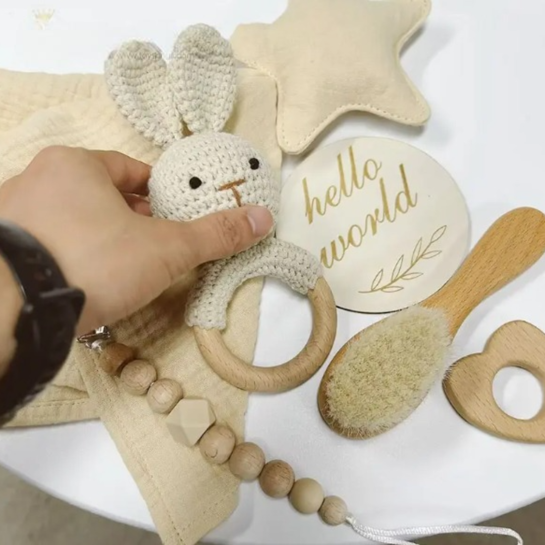 Printre elementele incluse se numara o jucarie crosetata manual in forma de iepuras, care emite un sunet placut si linistitor atunci cand este agitata, ajutand la relaxarea bebelusului. Peria de par moale si delicata este perfecta pentru a mentine parul bebelusului curat si bine ingrijit, fara a irita scalpul. Lantisorul pentru suzeta este un accesoriu util ce ajuta la pastrarea suzetei la indemana si previne pierderea acesteia. Mufflinul moale si delicat ofera un confort suplimentar, fiind ideal pentru momentele de somn sau joaca. Jucarioara de lemn ajuta la dezvoltarea abilitatilor motorii fine ale bebelusilor, iar cartonasul cu o urare calda de bun venit adauga o nota personala acestui cadou special.