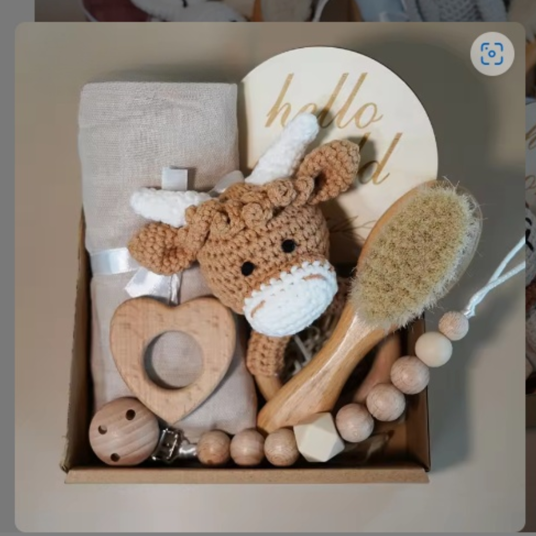 Set cadou pentru bebeluși, care include jucărie croșetată, lănțișor pentru suzeta, perie de păr și alte accesorii utile, toate ambalate într-o cutie elegantă.
