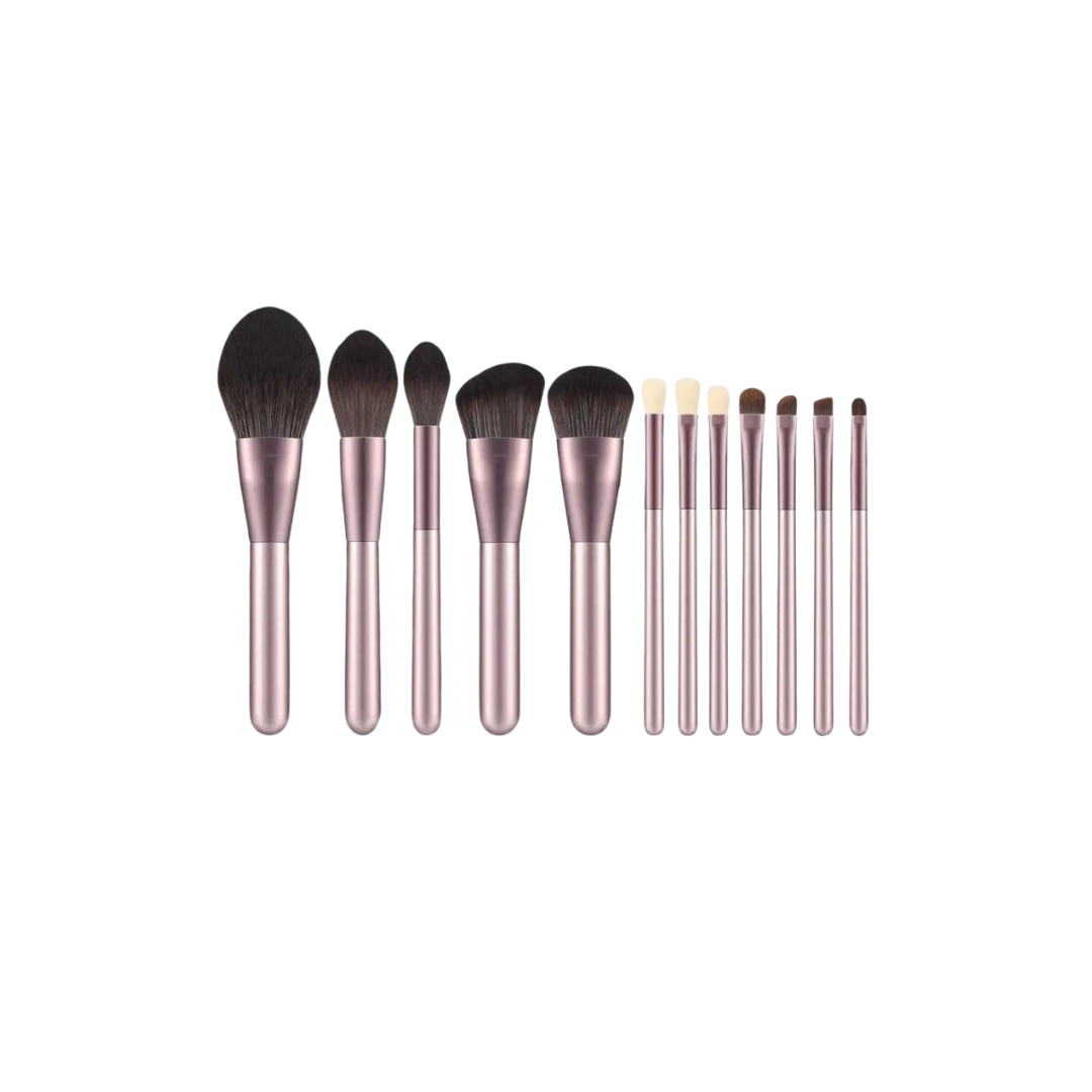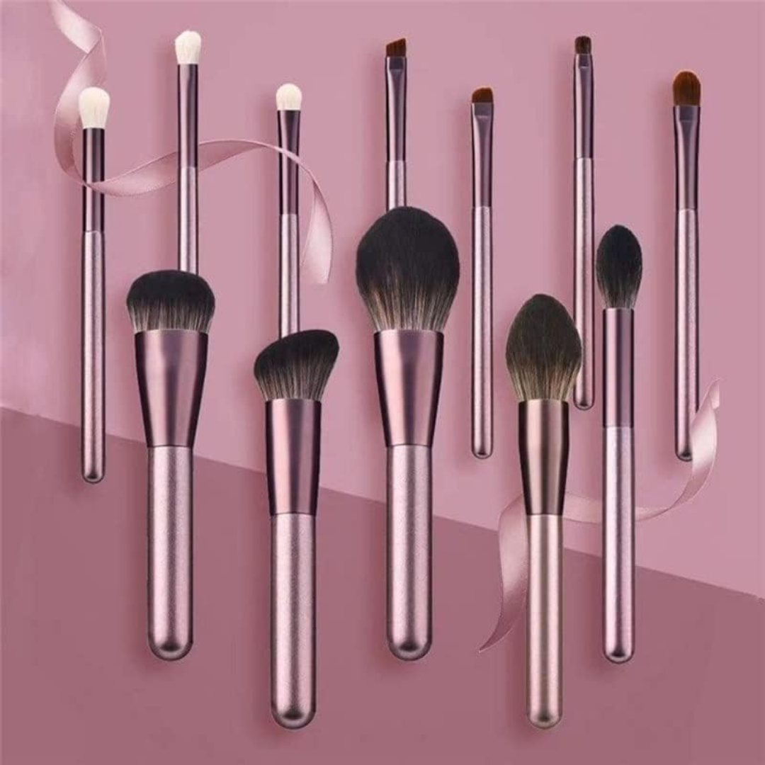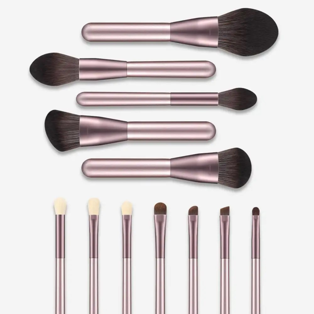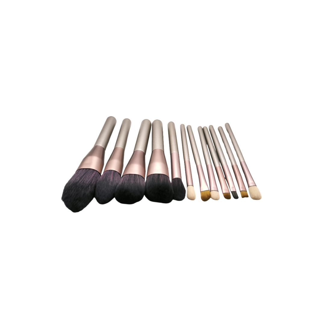 Set de 12 pensule de machiaj cu mâner metalic și păr sintetic moale, în nuanță mov sidefat, ideal pentru un machiaj uniform și precis.