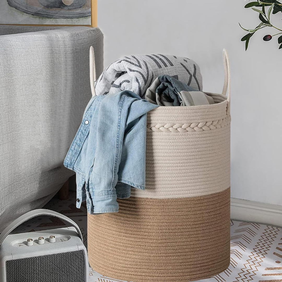 Cu o gamă largă de utilizări, acest coș decorativ poate găzdui diverse articole, precum haine, prosoape, pături, jucării pentru copii sau alte obiecte de uz casnic, contribuind la menținerea unui spațiu ordonat și organizat, fără a compromite aspectul estetic al camerei.