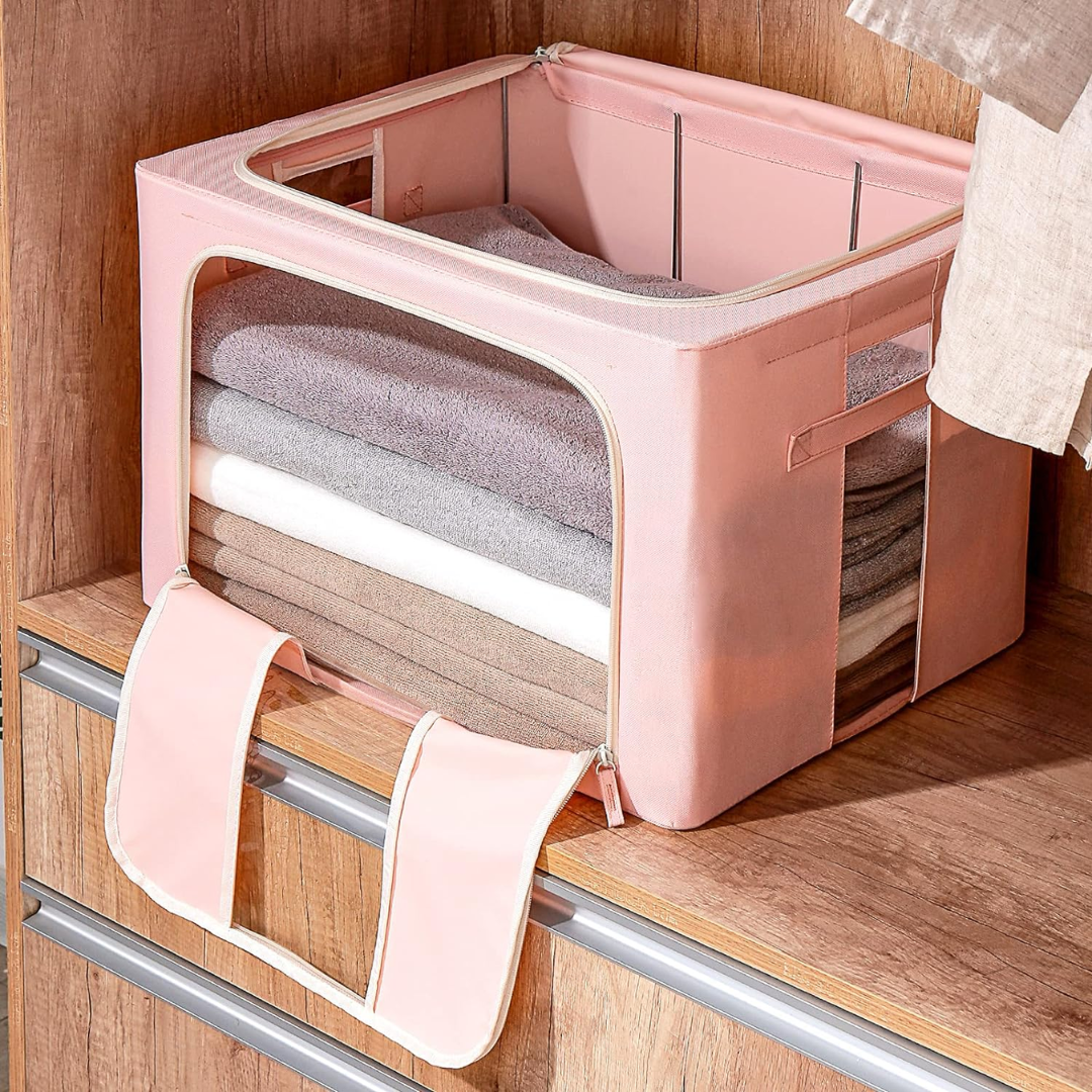 Cutie pliabilă din material textil roz, cu fermoar dublu, fereastră transparentă și mânere laterale, ideală pentru depozitarea hainelor și a altor obiecte.