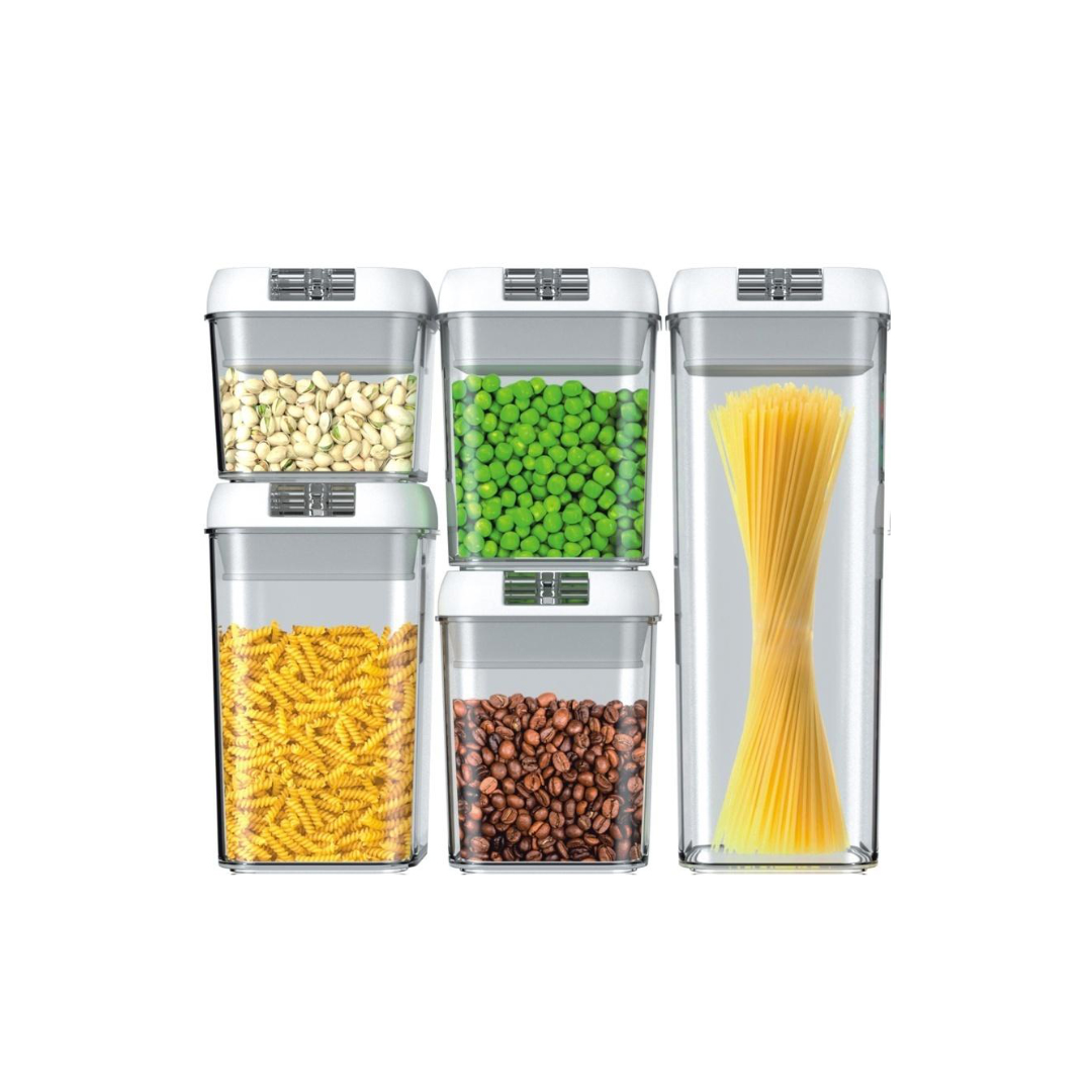 Organizează-ți bucătăria și cămara cu ajutorul acestui set de 5 recipiente special concepute pentru depozitarea perfectă a alimentelor. Imaginează-ți dimineți fără agitație, cu o bucătărie ordonată, unde fiecare ingredient esențial, de la făină și cereale, până la nuci și cafea, are locul său bine definit în aceste recipiente transparente, permițându-ți să identifici conținutul fără efort.