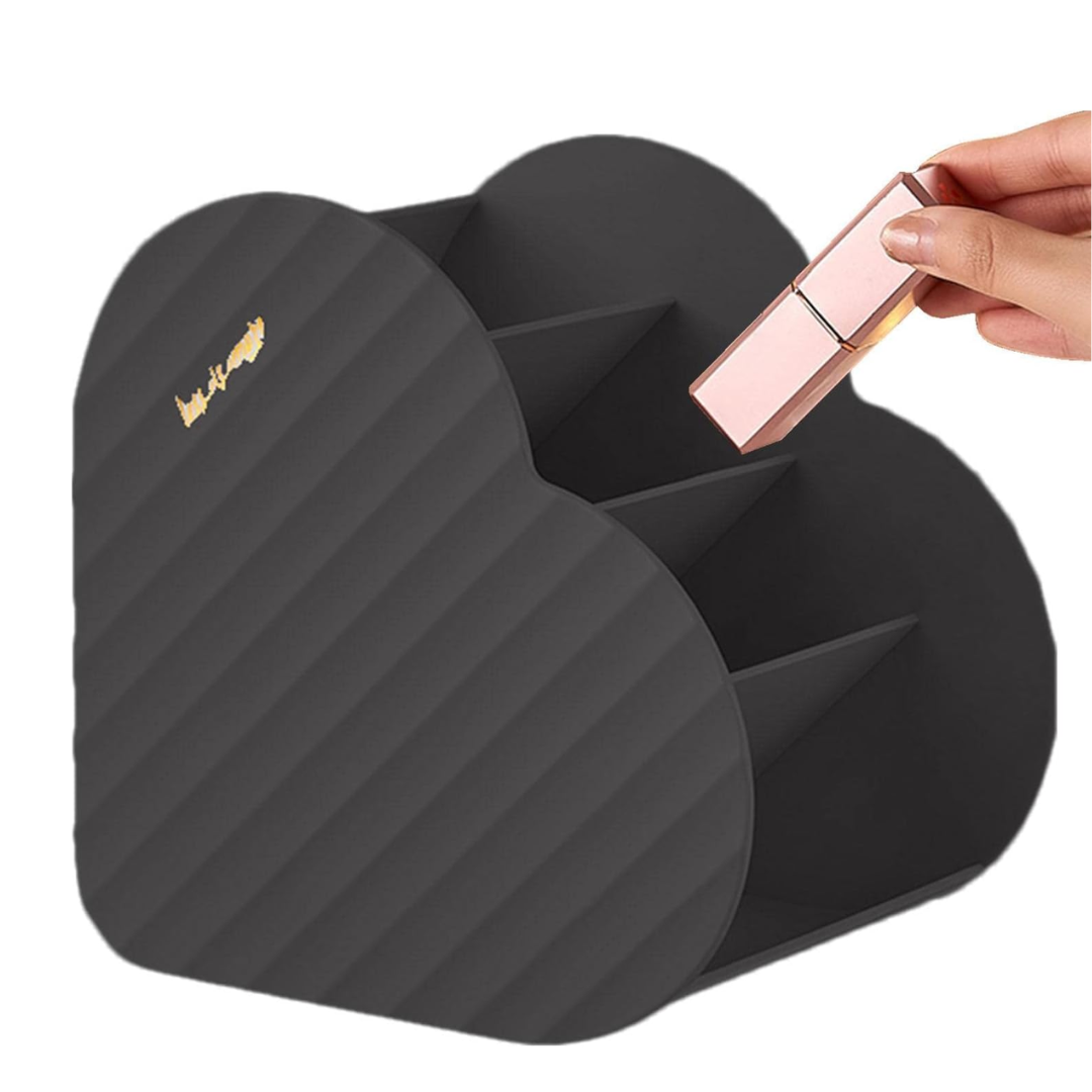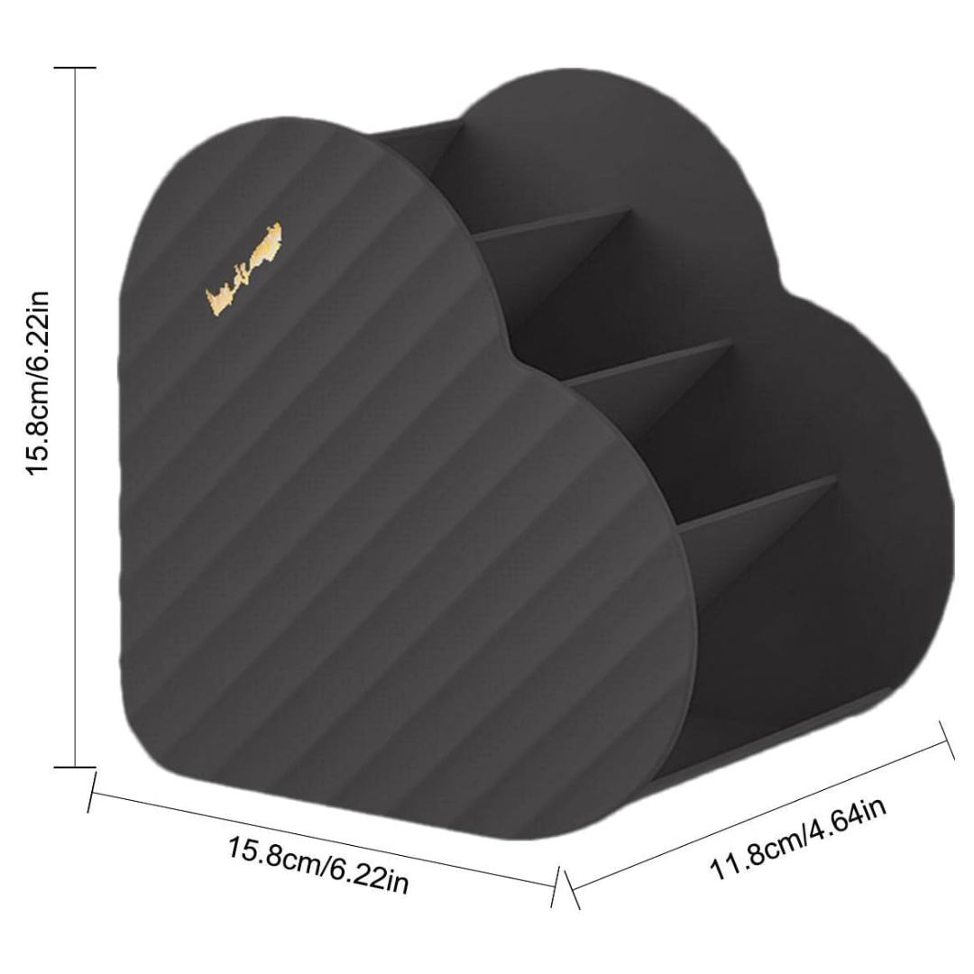 Suport din material plastic lucios în formă de inimă, cu 4 compartimente (corectat față de descrierea inițială care menționa 3 compartimente). Este o opțiune practică și decorativă pentru depozitarea accesoriilor de machiaj, instrumentelor de scris sau diverse obiecte pe care le dorești la îndemână.