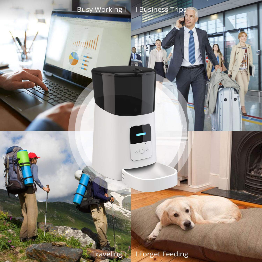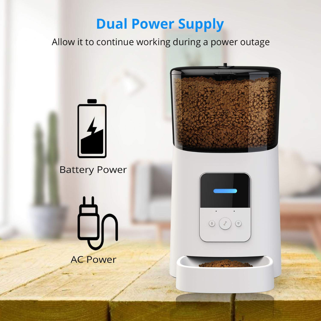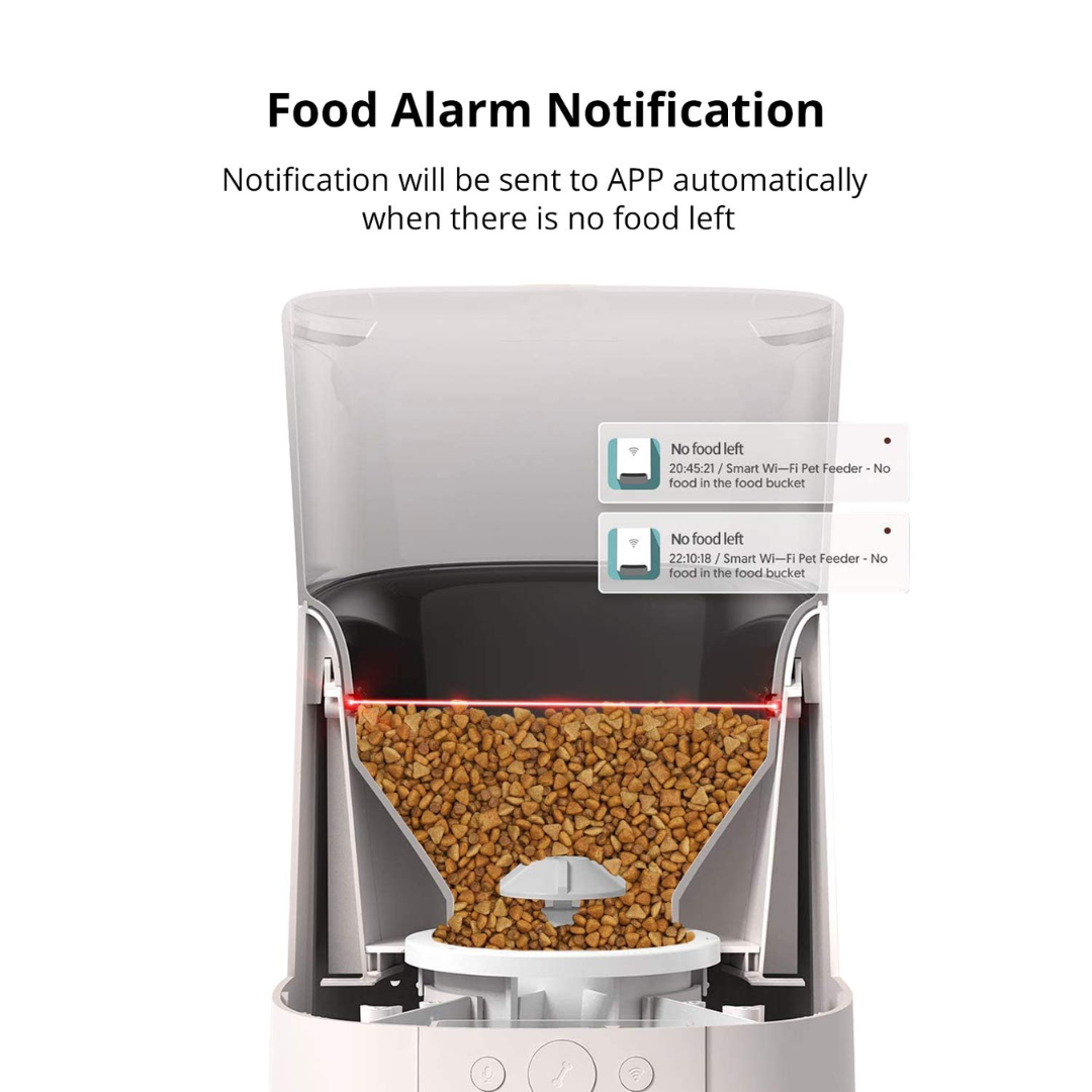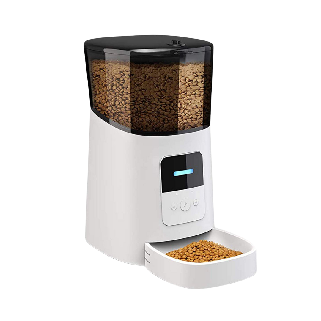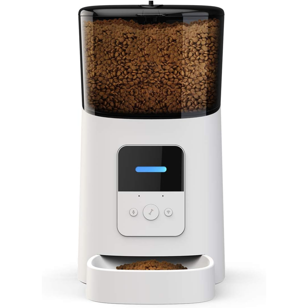 Dispenser automat de hrană pentru câini și pisici, alb, programabil prin aplicație, cu capacitate de 6 litri și funcție de conectare WiFi.