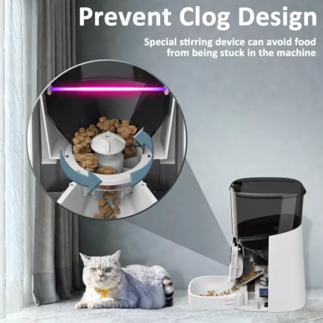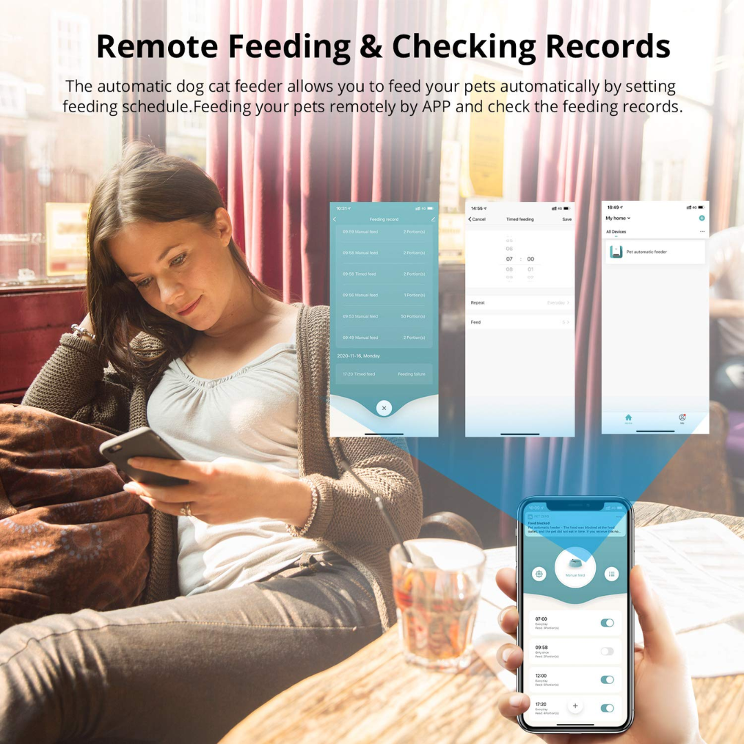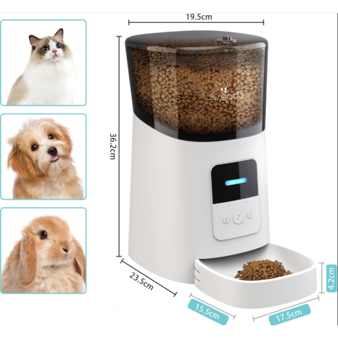 Dispenserul automat pentru câini și pisici, cu o capacitate generoasă de 6 litri, este soluția ideală pentru a asigura hrănirea regulată și eficientă a animalelor de companie. Conectivitatea WiFi și funcția de programare prin aplicație oferă un control complet asupra porțiilor și o monitorizare simplificată, direct de pe dispozitivele inteligente. În plus, funcția de înregistrare vocală permite calmarea animalului în timpul hrănirii, iar tehnologia cu inducție în infraroșu previne supraîncărcarea bolului de hrană.