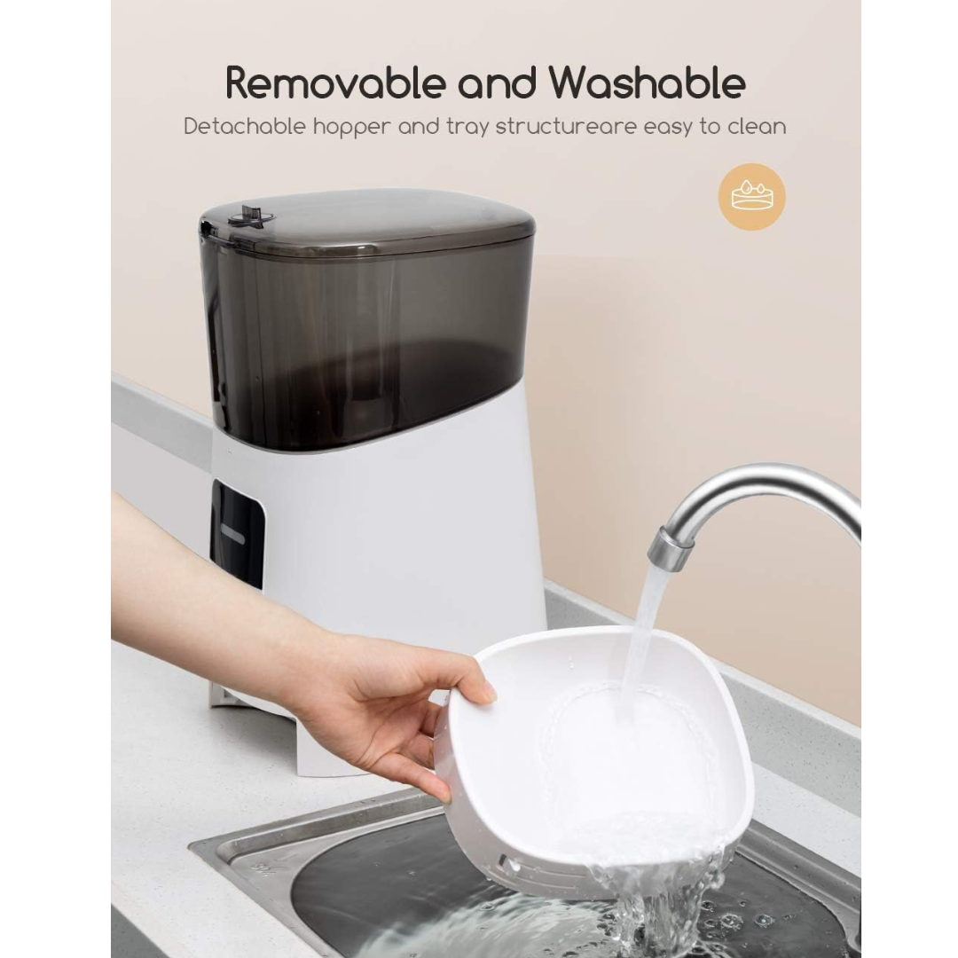 Fabricat din materiale durabile, dispenserul este echipat cu alimentare duală (priză și baterii) pentru o funcționare neîntreruptă. Curățarea ușoară și designul stabil fac din acest dispozitiv un accesoriu practic și fiabil. Este ideal pentru stăpânii ocupați care doresc să asigure o alimentare optimă și un confort sporit pentru animalele lor de companie.