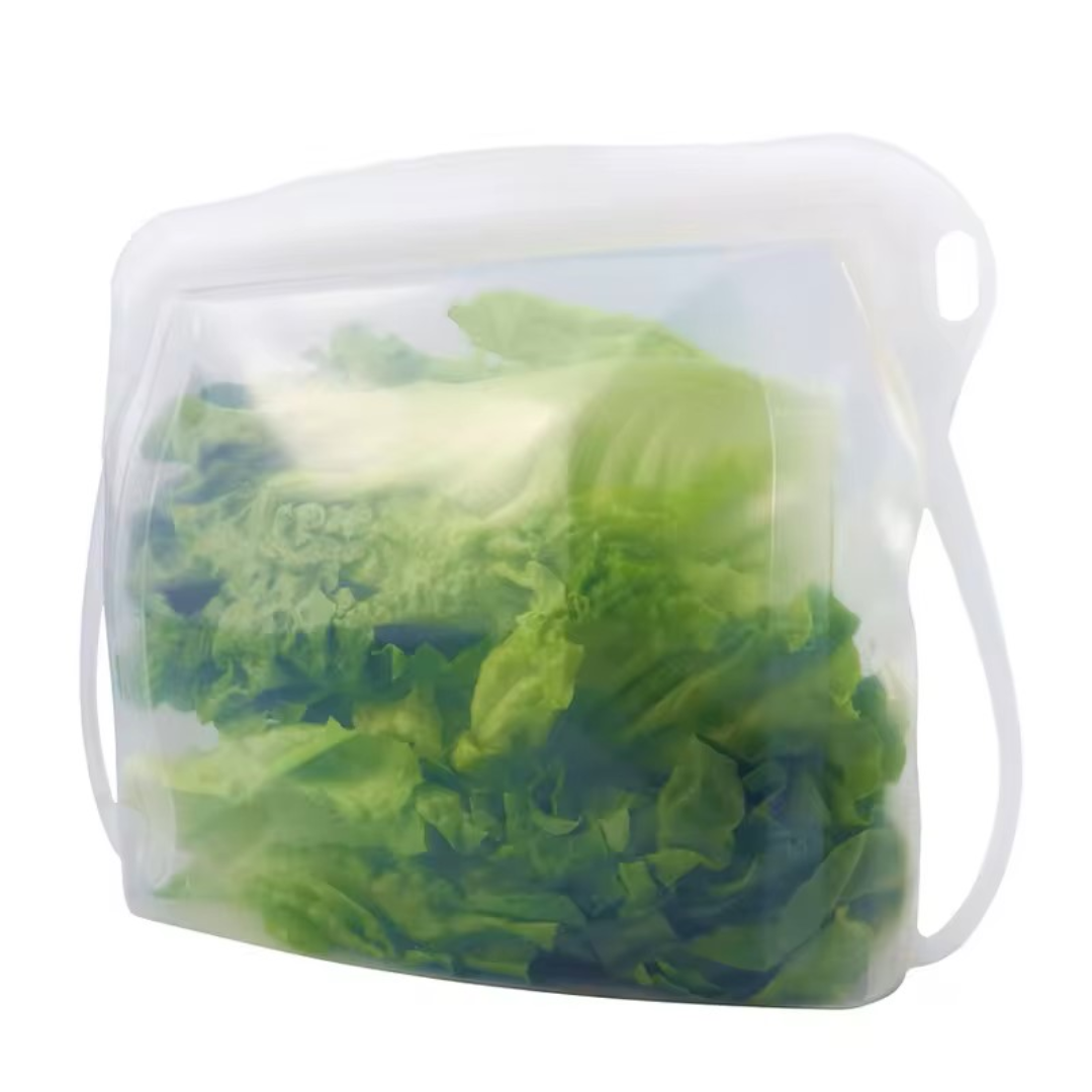 Pungă din silicon alimentar, 1L, transparentă, pentru depozitarea ecologică a alimentelor, cu închidere ermetică.