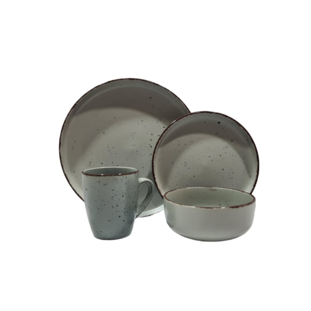 Set de 16 piese din ceramică gri, design rotund, perfect pentru 4 persoane, compatibil cu mașina de spălat vase și cuptorul cu microunde.