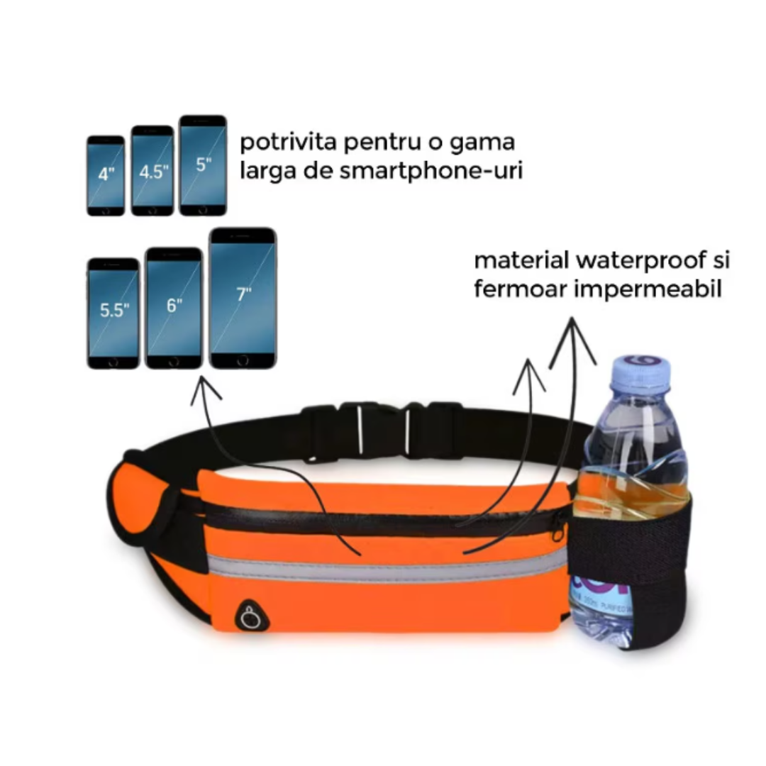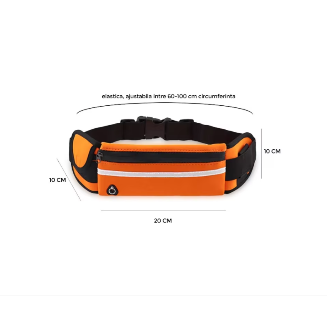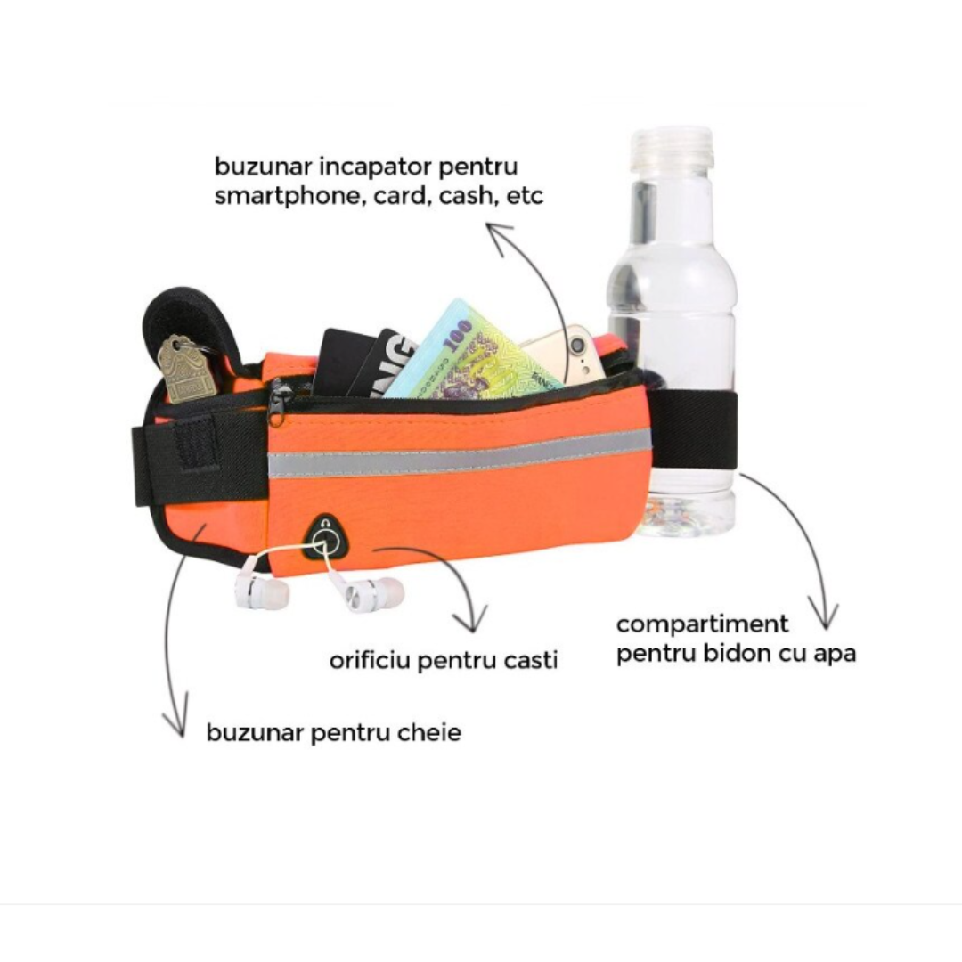 Această centură pentru sport tip borsetă este un accesoriu extrem de util și eficient pentru organizarea obiectelor personale în timpul alergării sau altor activități sportive. Este prevăzută strategic cu un buzunar mare pentru telefon, card sau alte obiecte necesare, un buzunar mic pentru chei și un compartiment special, elastic, pentru bidonul cu apă sau energizant.