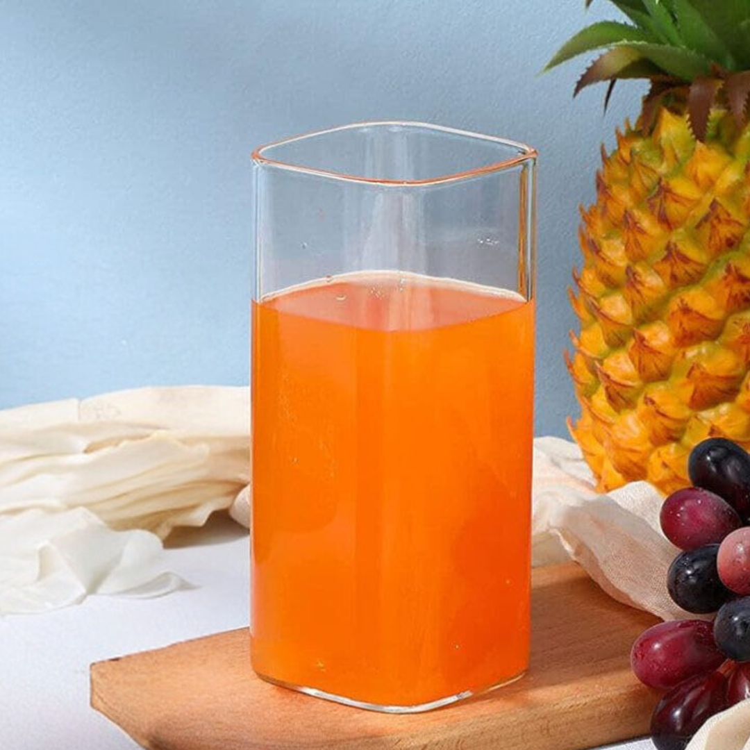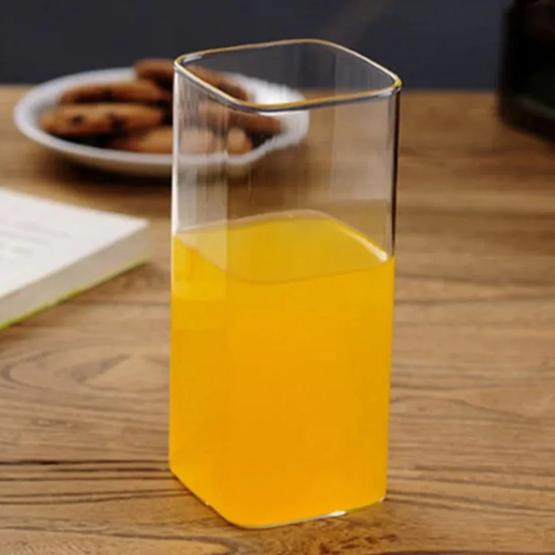 Pahar dreptunghiular din sticlă termorezistentă, ideal pentru băuturi reci sau fierbinți, capacitate 400 ml.