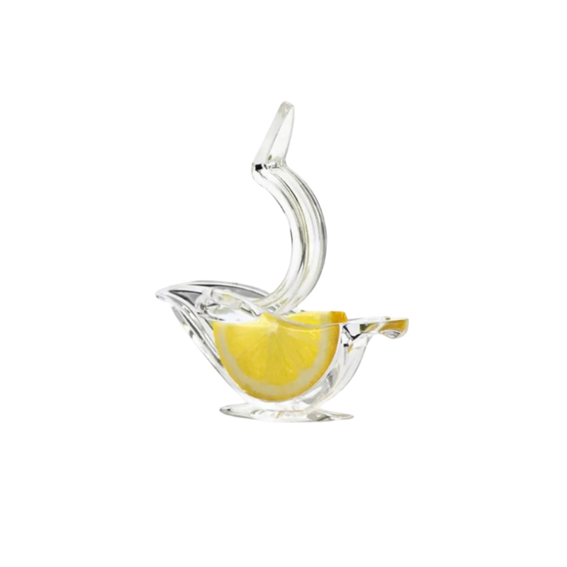 Storcător manual în formă de pasăre, din plastic transparent, ideal pentru stoarcerea lămâilor.